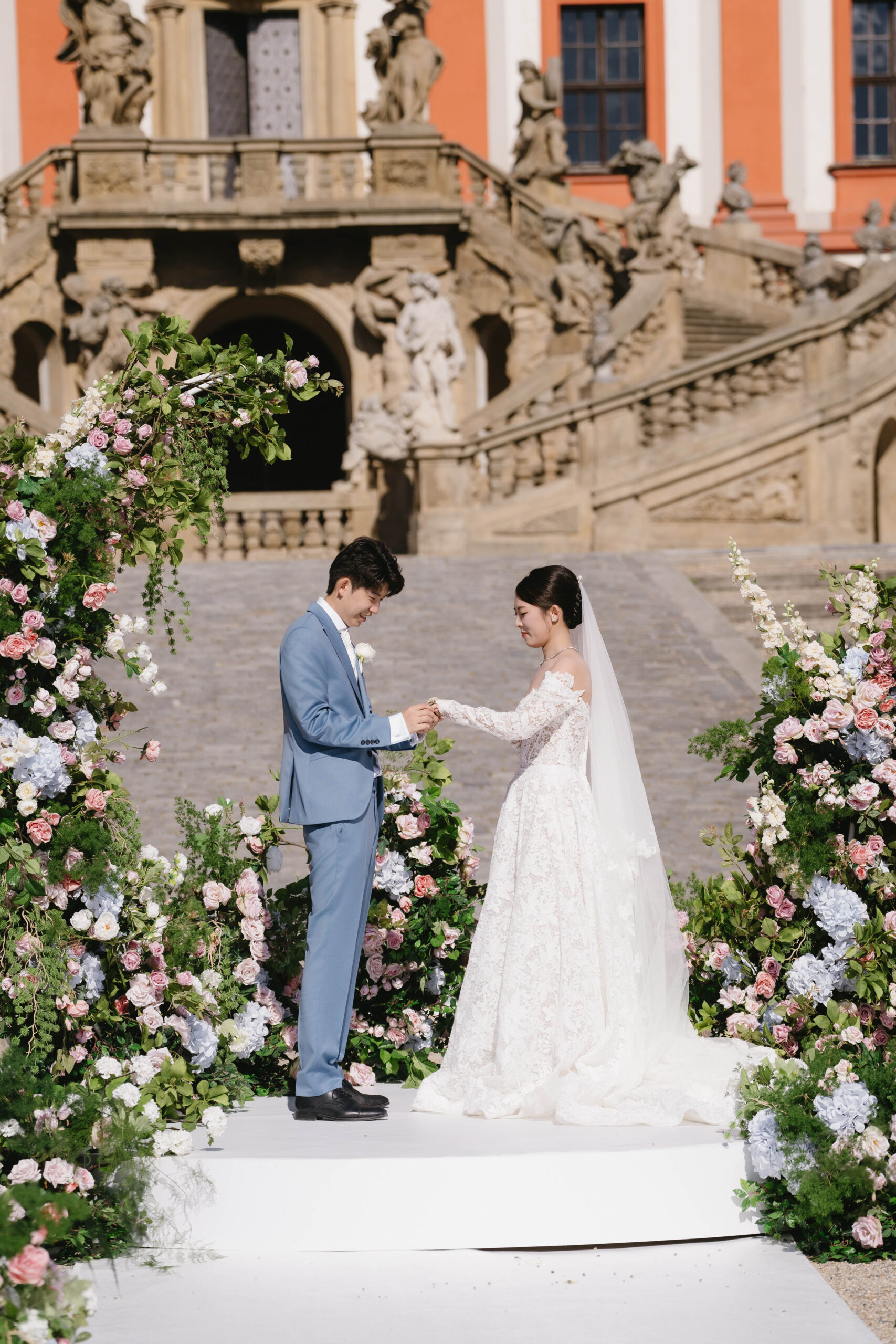 A bride in a white gown and a groom in a blue suit stand facing each other on an outdoor platform, exchanging rings at their Luxury Prague Wedding, surrounded by lush floral arrangements and a grand staircase in the background.