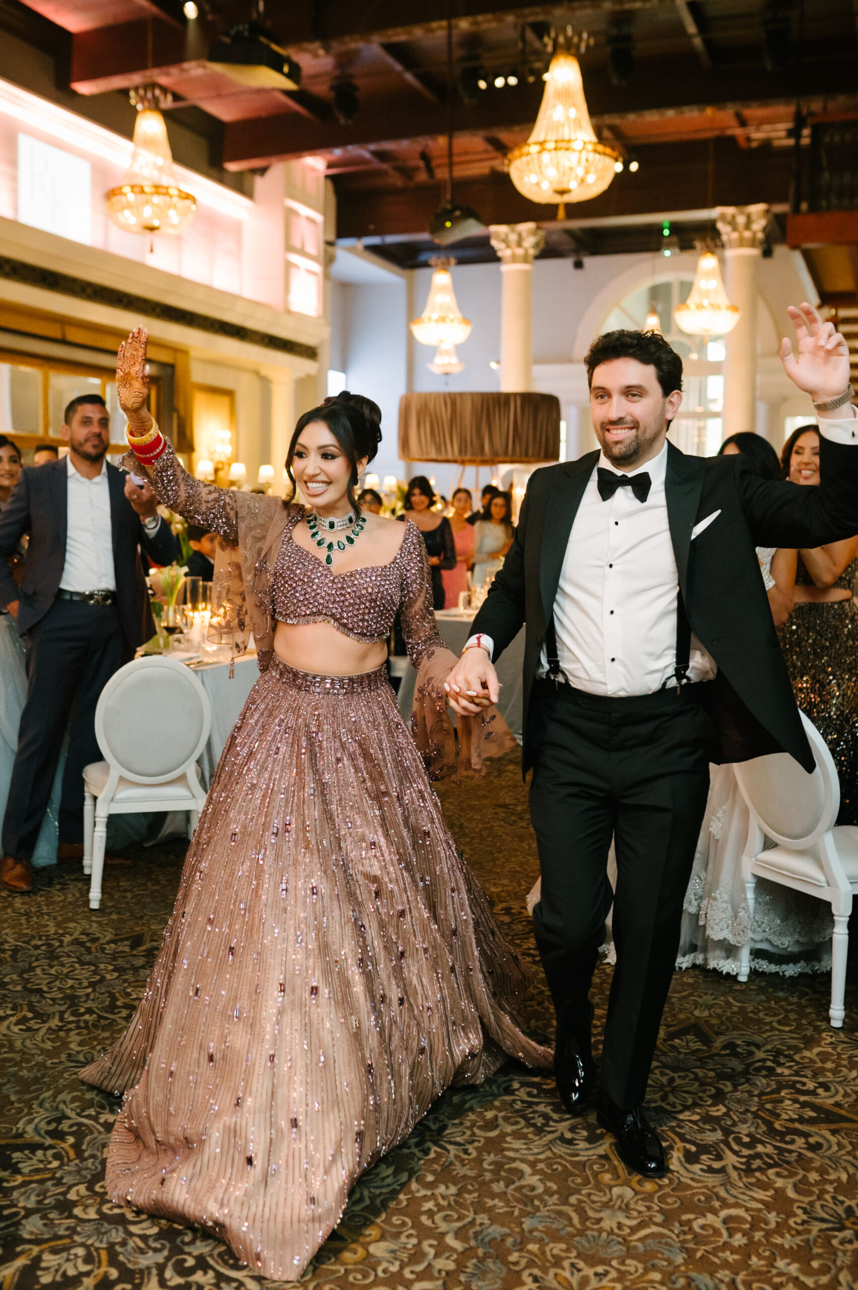 A smiling couple holding hands enters a decorated event hall adorned in modern classic wedding design; the woman wears an embellished mauve lehenga and the man a black tuxedo. Guests in formal attire celebrate their entrance under sparkling chandeliers.