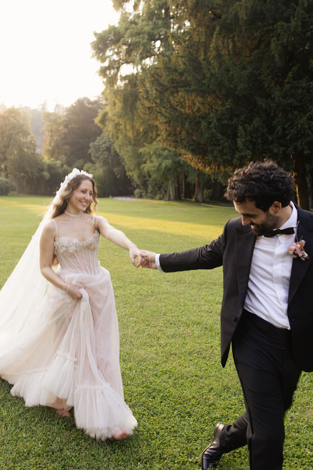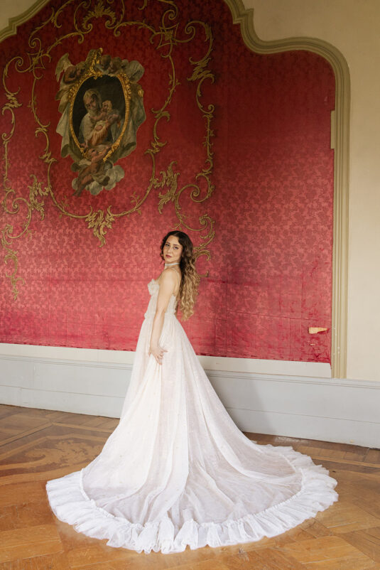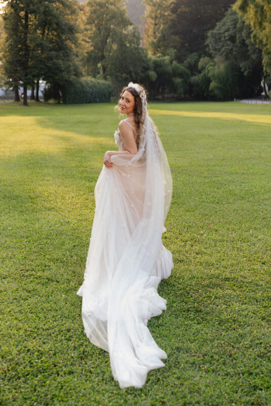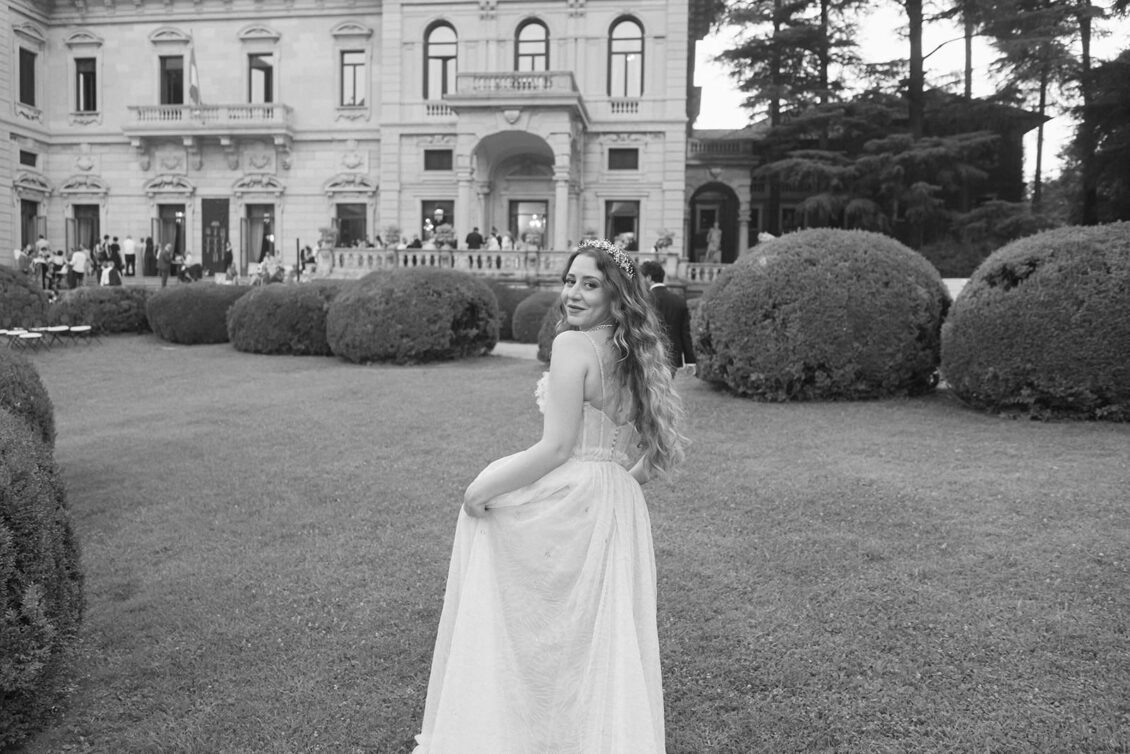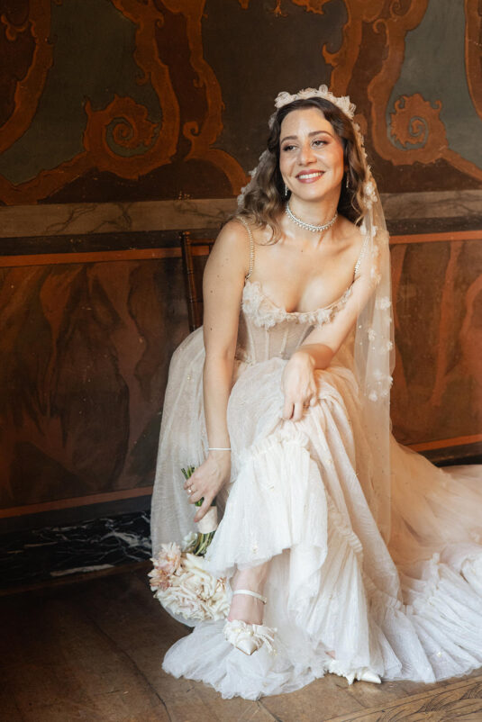 The bride embodied the aesthetic perfectly, wearing a Sandra Mansour gown that felt ethereal and poetic, as though she had stepped directly from the canvas of a Victorian portrait. Her look added to the immersive narrative that defined the celebration — one where beauty, fashion, and architecture worked in harmony. Whimsical hand-painted place cards offered a personalized, artistic touch, reinforcing the sense that this Lake Como destination wedding was not just curated, but composed like a work of art.