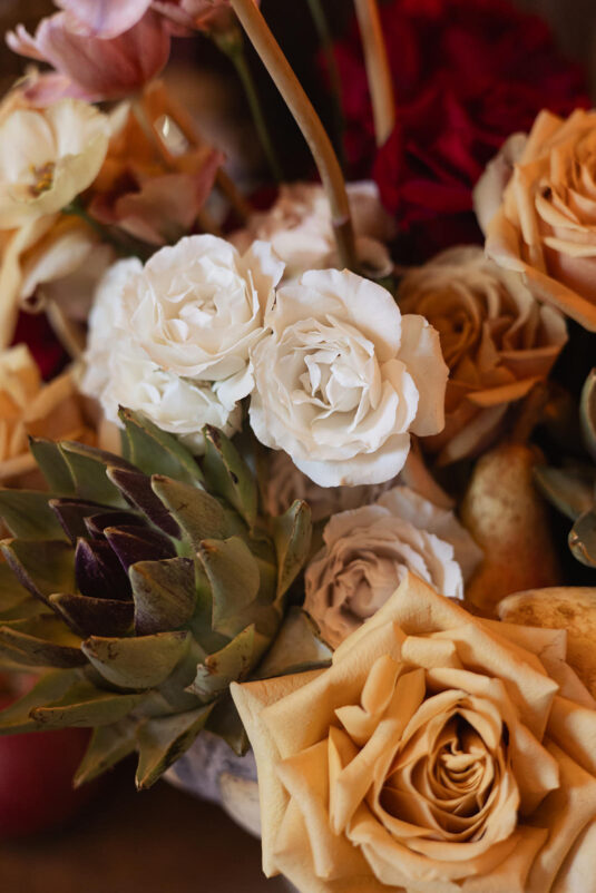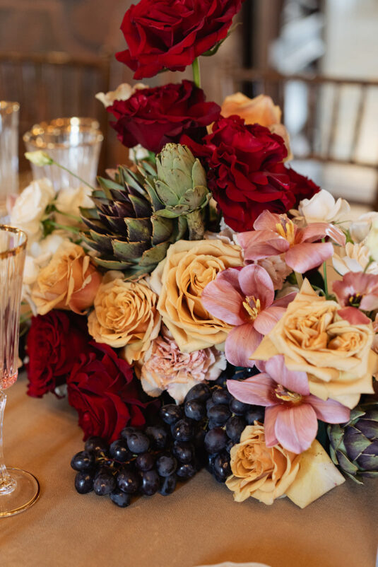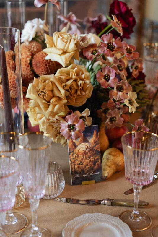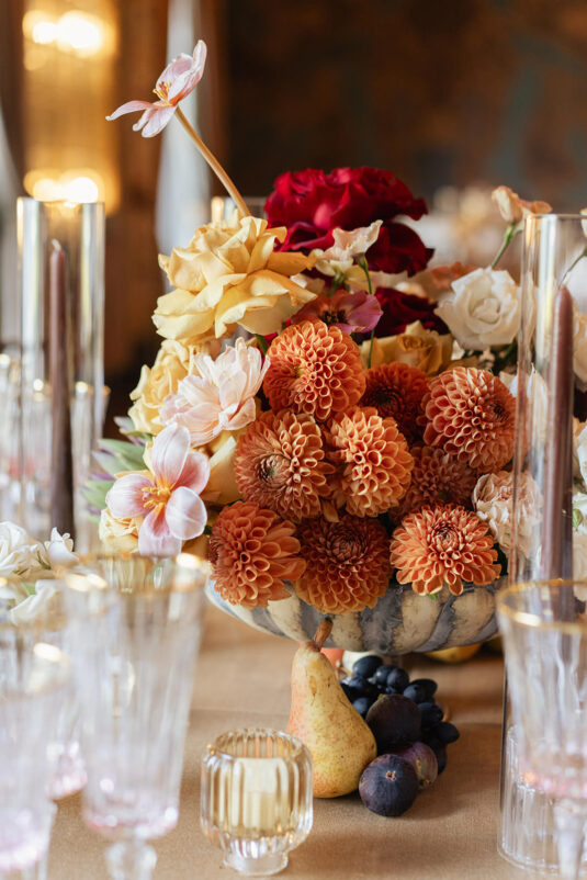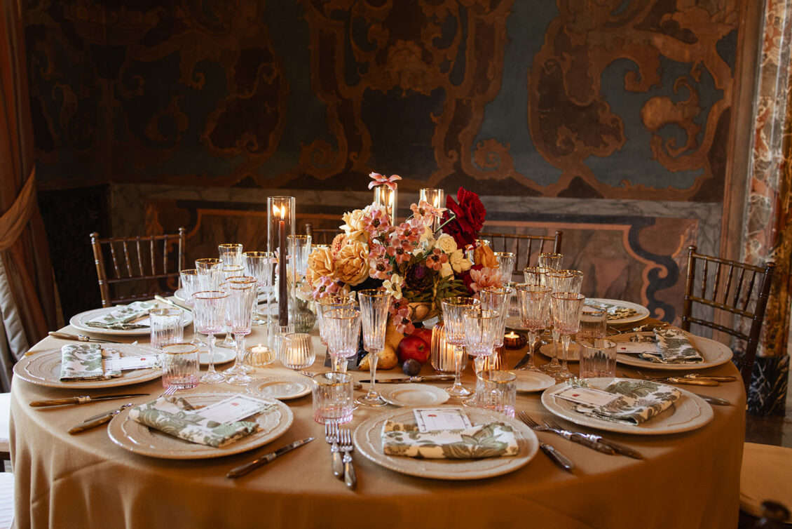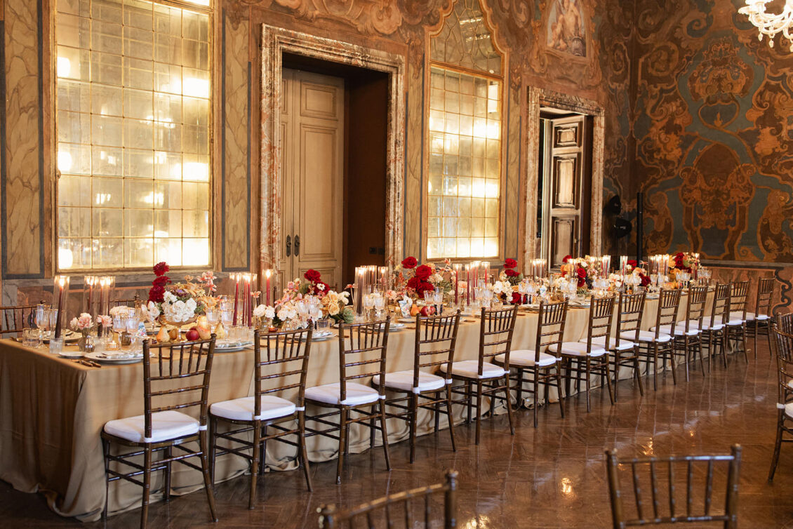 From the moment guests arrived, the neoclassical architecture and hand-painted murals set a dramatic tone for the day. Soft candlelight flickered across sculptural floral arrangements, creating a painterly glow that enhanced the old-world charm of the setting. The floral palette leaned into romantic, artful tones, with arrangements designed to feel almost sculptural, elevating the visual storytelling of this Lake Como destination wedding. Tables were styled in a Renaissance-inspired fashion, adorned with fruit, vintage details, and cascading candlelight that felt both historic and effortlessly modern.