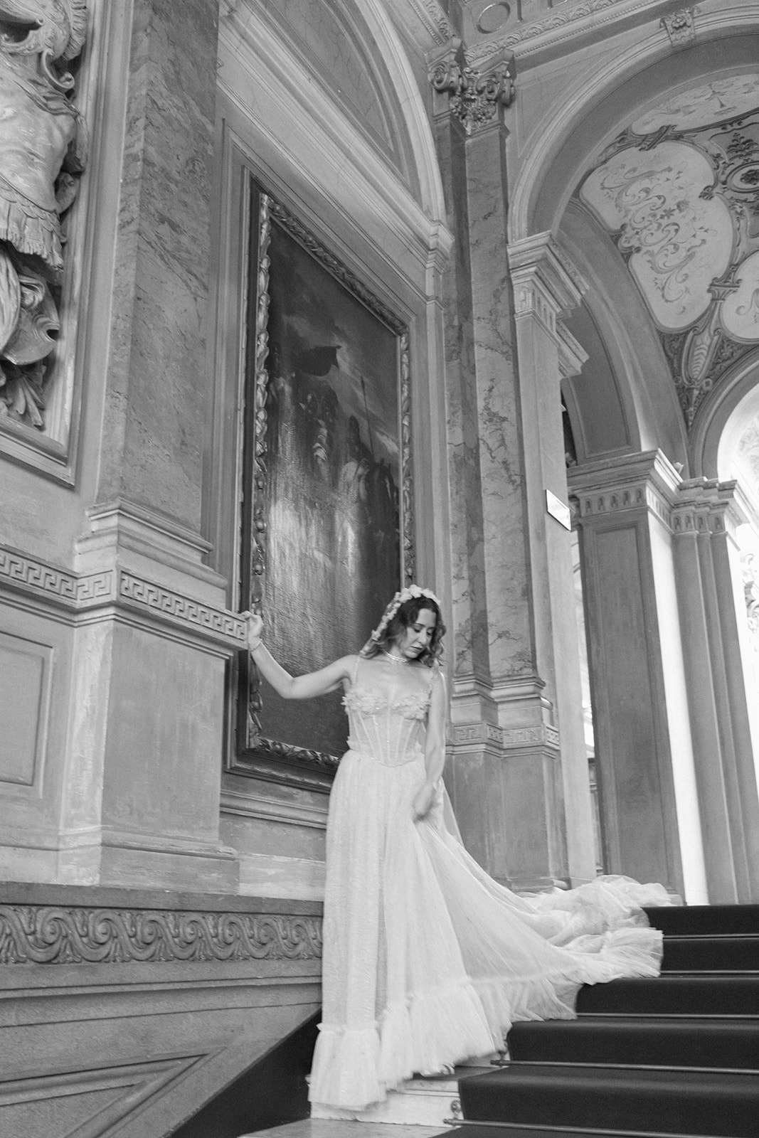 A woman in a long, flowing, white wedding dress stands on ornate stairs in a grand, classical building with tall columns and arches—a Baroque-inspired wedding scene that is elegant and timeless in black and white.