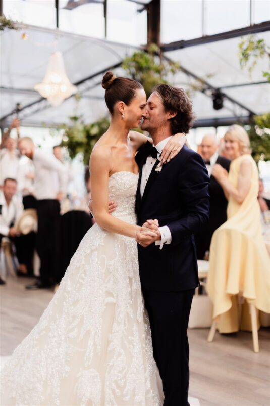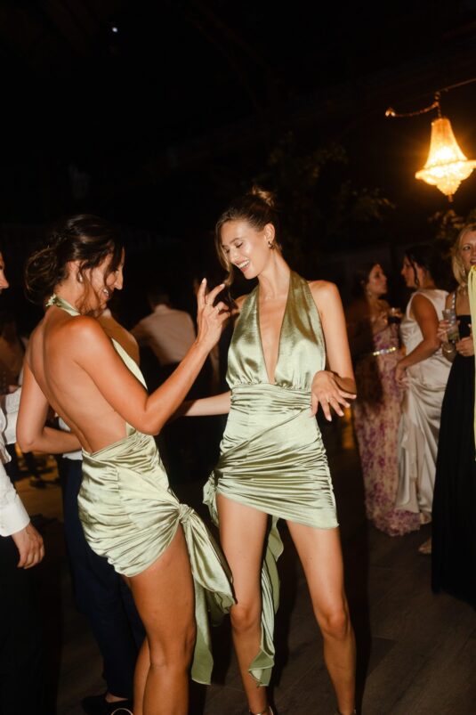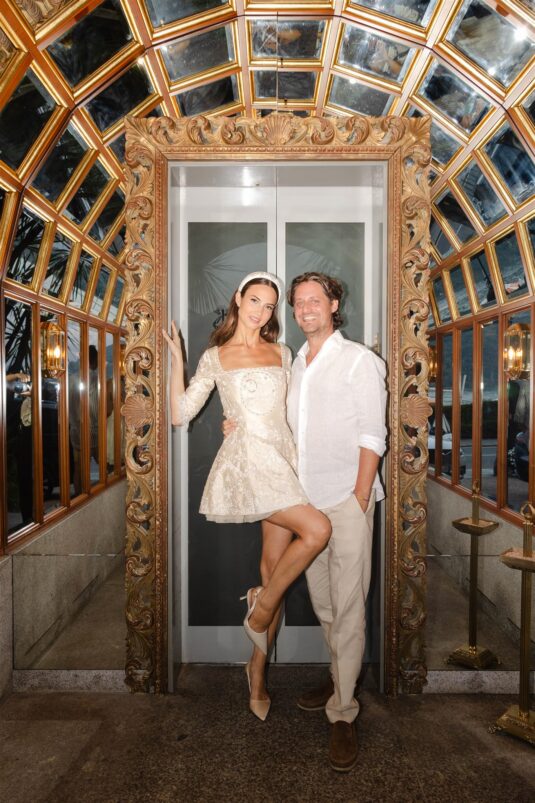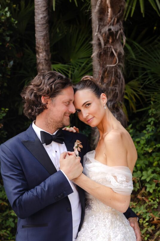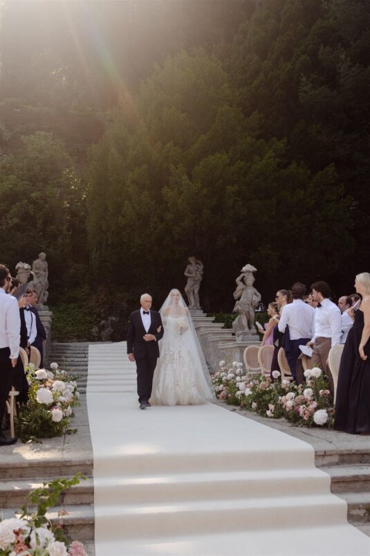 Alice walked down the aisle in an embellished Elie Saab gown, its sweeping train and veil adding couture drama against the glistening lake. A sleek bun and natural makeup allowed the craftsmanship of the gown to shine. Later, she changed into a custom silk slip dress by Silvia Astore, delicately finished with French lace—an understated yet striking choice for the reception.