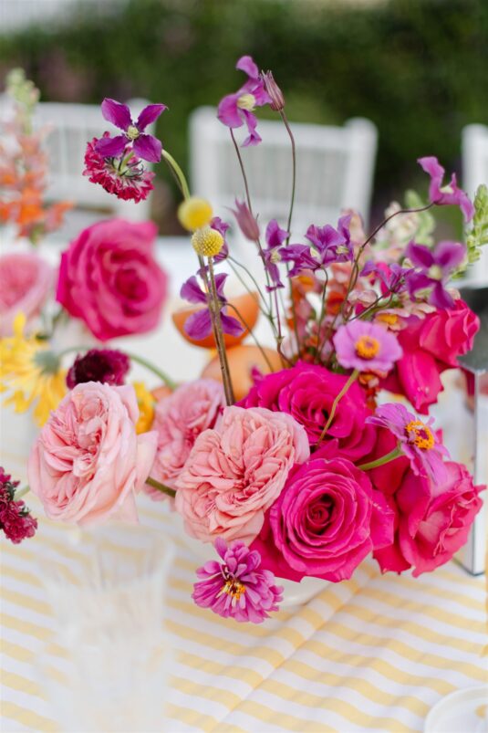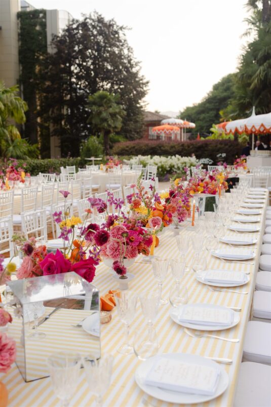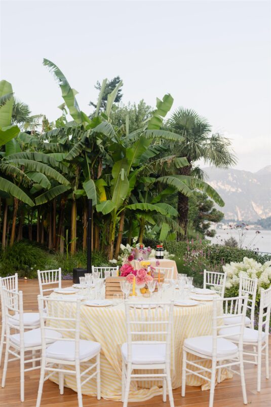The weekend began at Grand Hotel Tremezzo with a vibrant Italian garden–inspired welcome dinner. Yellow striped linens, bold florals, and sun-drenched hues set a celebratory tone, introducing guests to the couple’s playful yet refined aesthetic. For the ceremony at Villa Pizzo, the palette softened into blush pinks, crisp whites, and fresh greenery, reflecting the timeless romance at the heart of this modern Lake Como wedding.