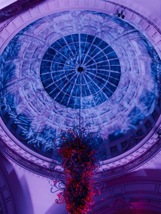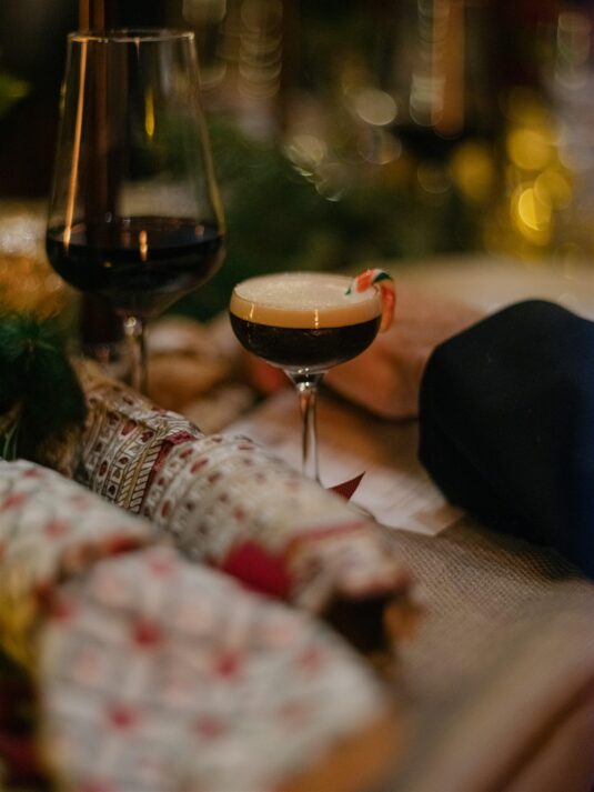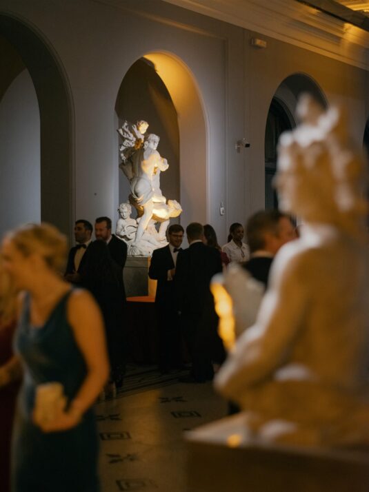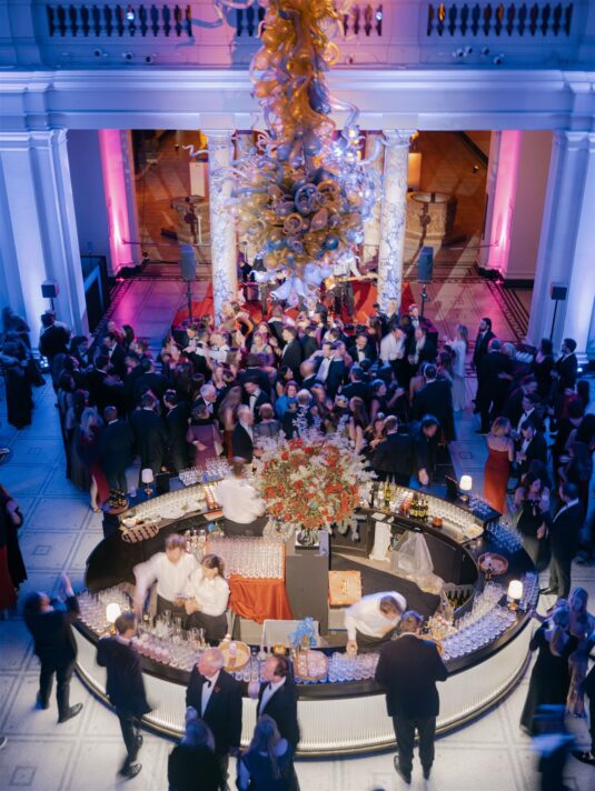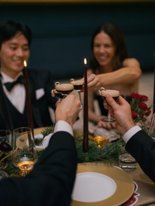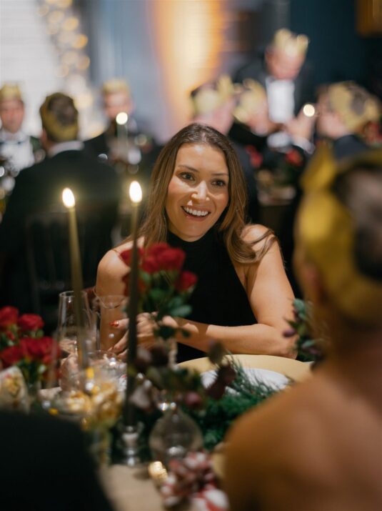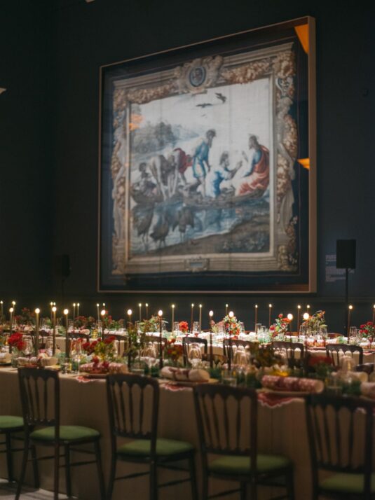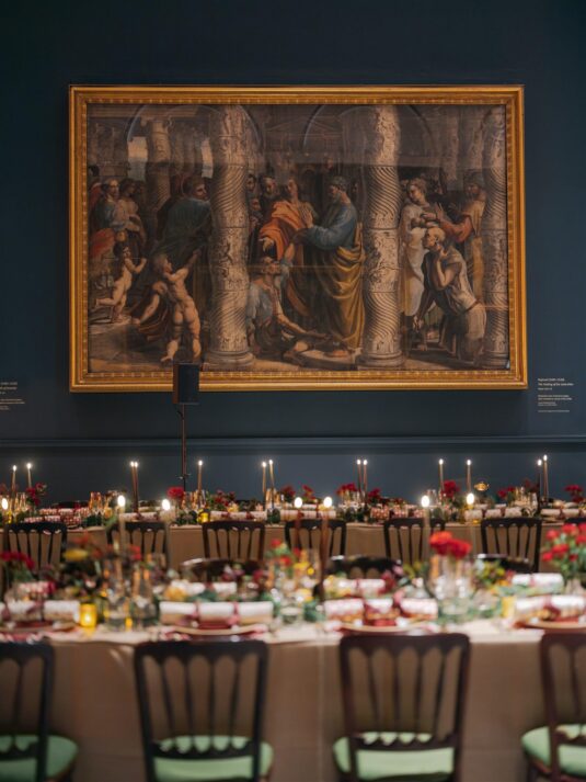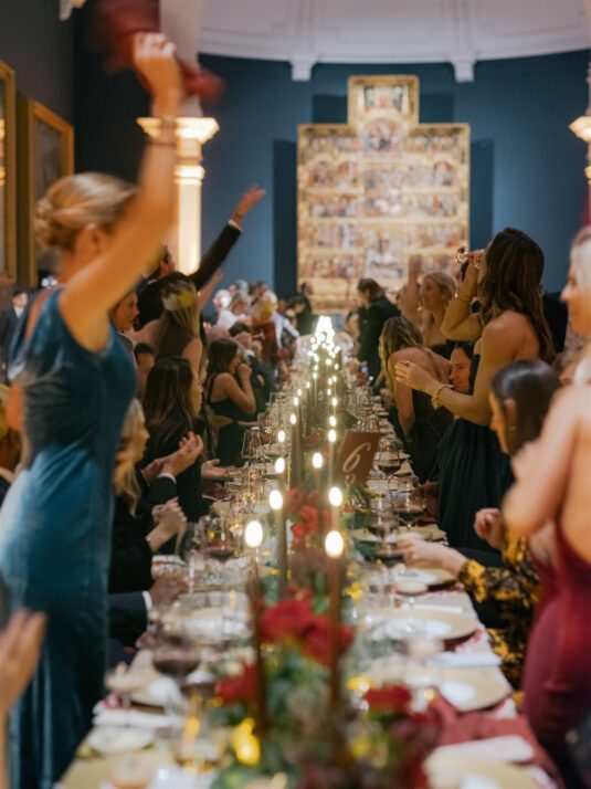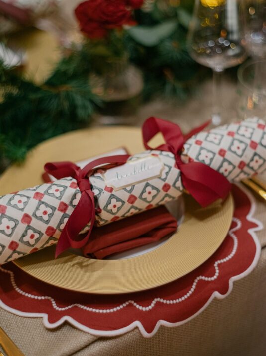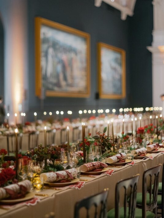 Two grand tables stretched through the gallery, dressed in cream linen and layered with festive details: gold-edged chargers, deep red placemats, velvet-green chair cushions, and florals featuring roses, pinecones, and textured foliage. Handmade Christmas crackers doubled as place cards, adding a playful touch to the elegant setting. After dinner, guests were served tiny espresso martinis topped with miniature candy canes before moving into the museum’s Dome for dancing, desserts, and late-night cocktails.
