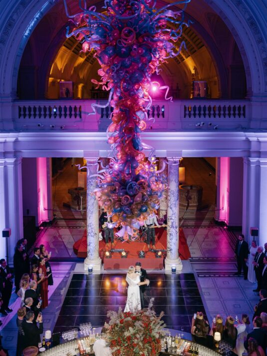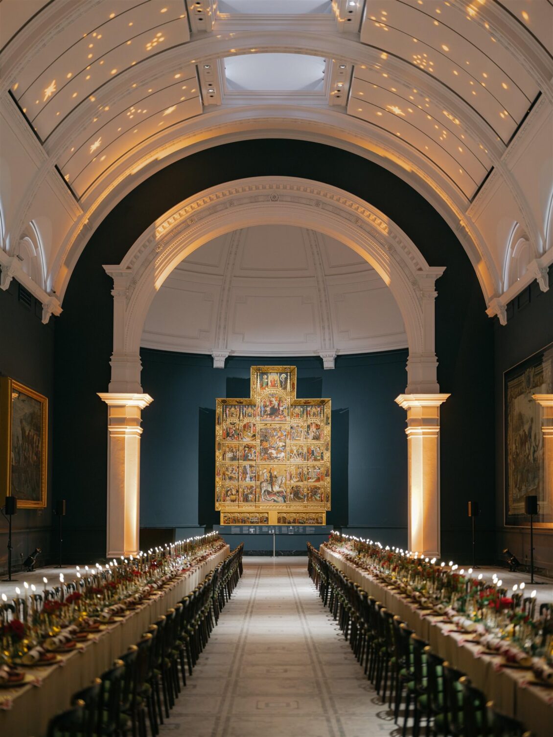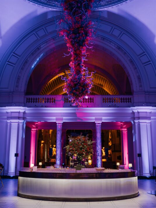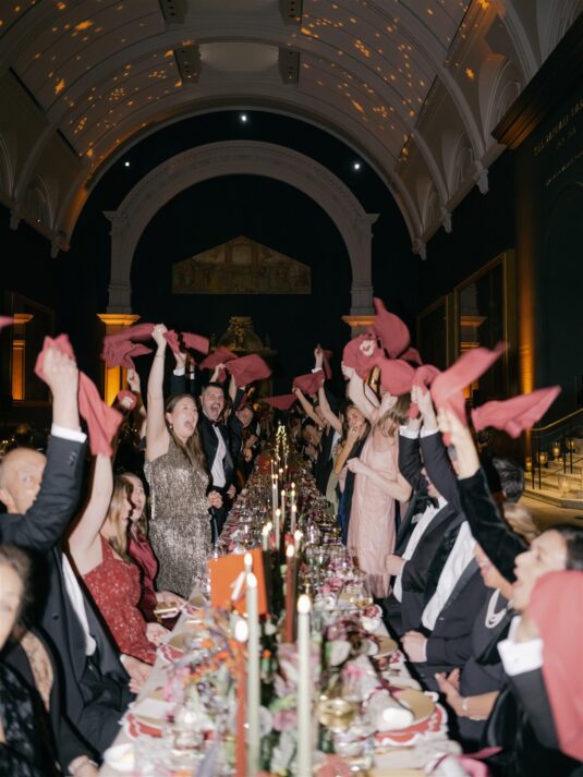 The journey continued in true London style as traditional red Routemaster buses transported guests through the city to the iconic Victoria and Albert Museum. The museum’s Hintze Gallery served as the setting for cocktails, where guests sipped Gusbourne English sparkling wine surrounded by sculptures and historic grandeur. From there, the evening’s highlight unfolded in Raphael Court—an awe-inspiring space that transformed into the heart of this unforgettable Christmas wedding at the V&A.