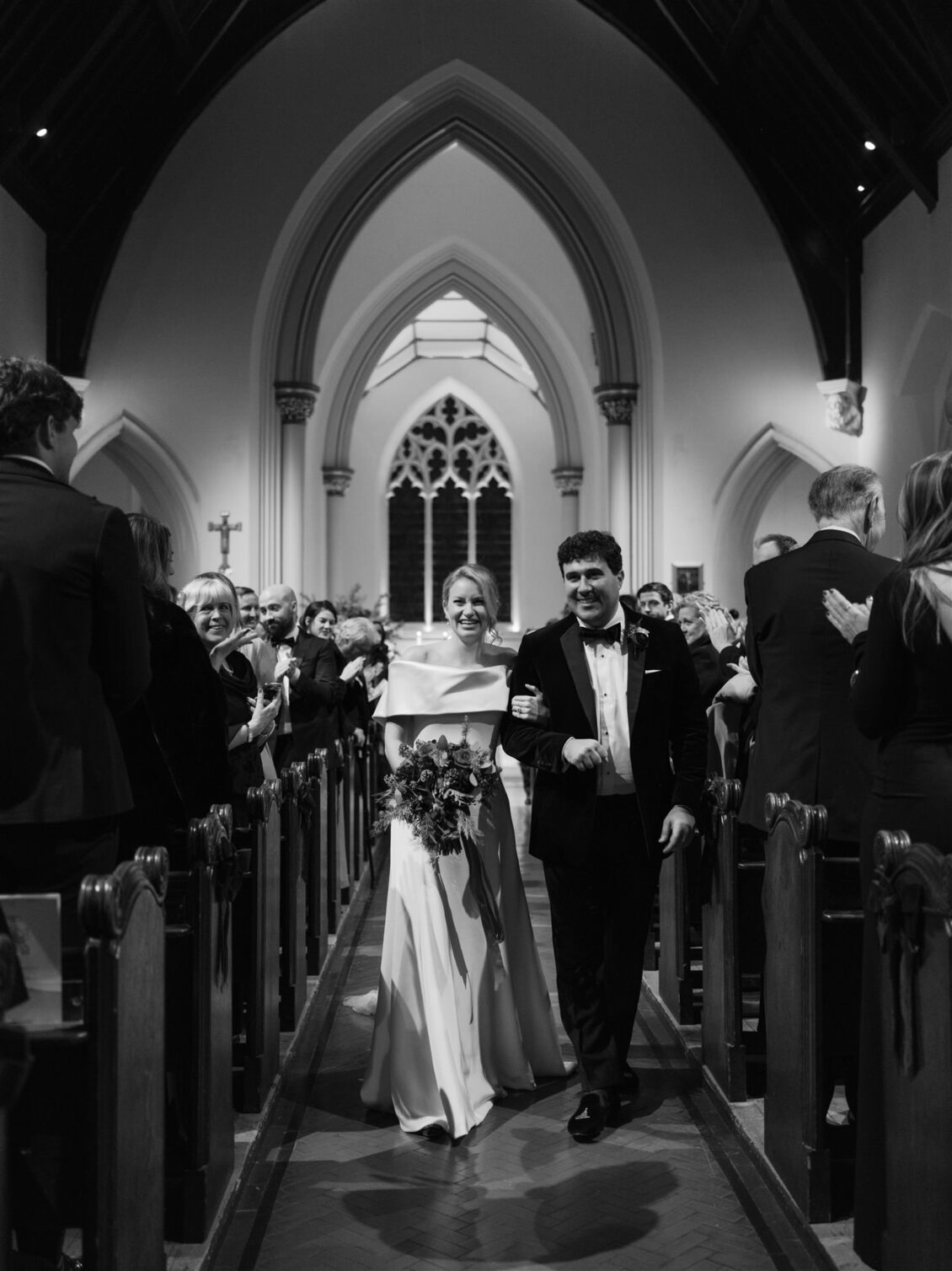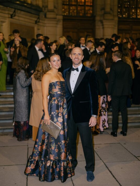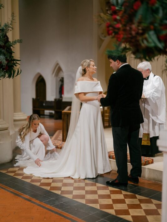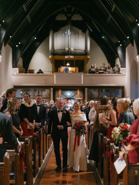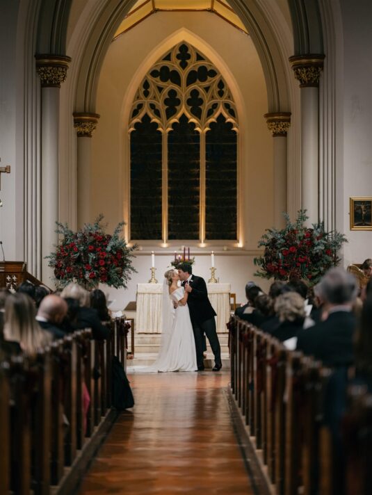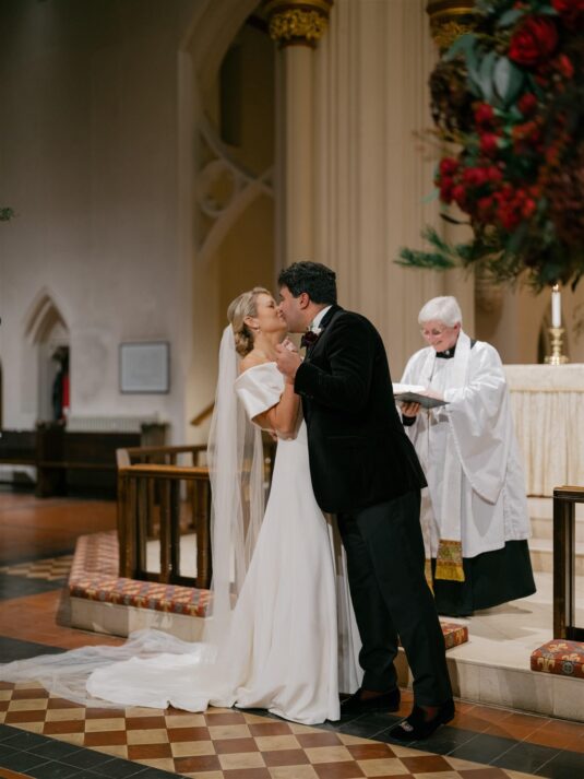 The celebration began with a classic church ceremony at St Mary’s the Boltons, where Erin arrived in a breathtaking Phillipa Lepley gown that perfectly complemented the winter setting. Her bouquet—woven with red roses, evergreen foliage, and pinecones tied with velvet ribbon—offered the first hint of the Christmas palette that would define their Christmas wedding at the V&A. Following the ceremony, guests gathered at The Beauchamp, a beloved London pub, where champagne, Guinness, and comforting British classics created a warm and convivial atmosphere.