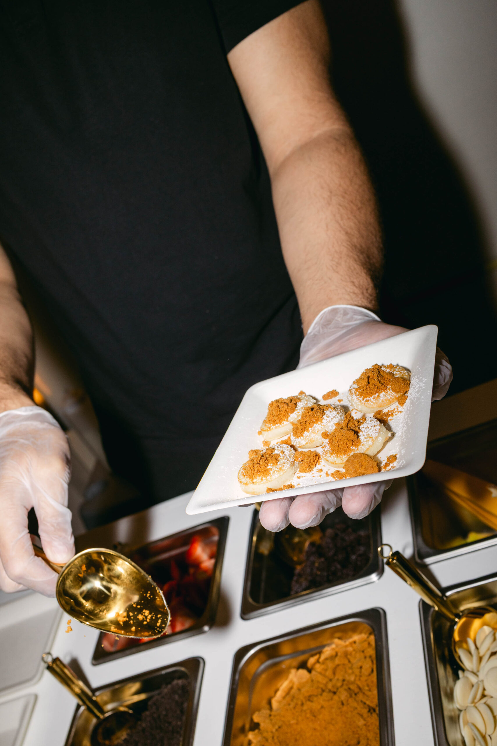 At a Pearle Hotel wedding, a person wearing gloves holds a white plate with small food items topped with spices, sprinkling more seasoning from a gold spoon over a food station filled with various ingredients.