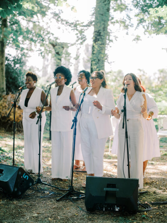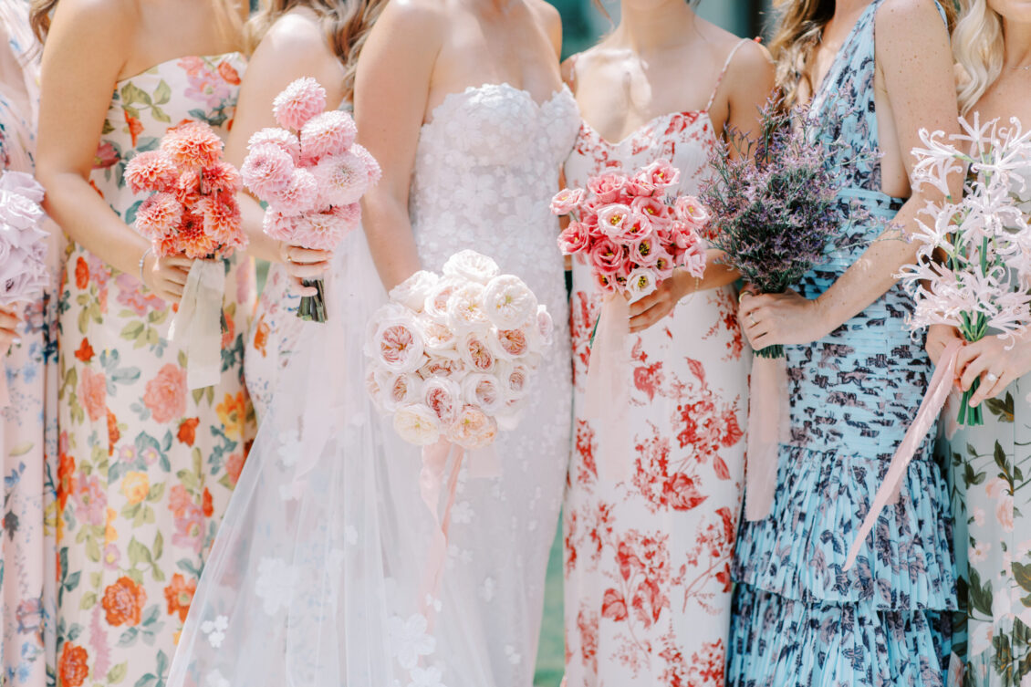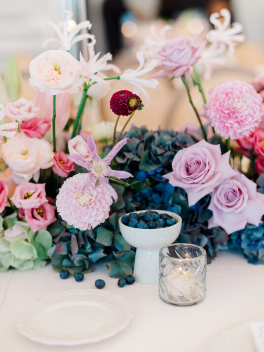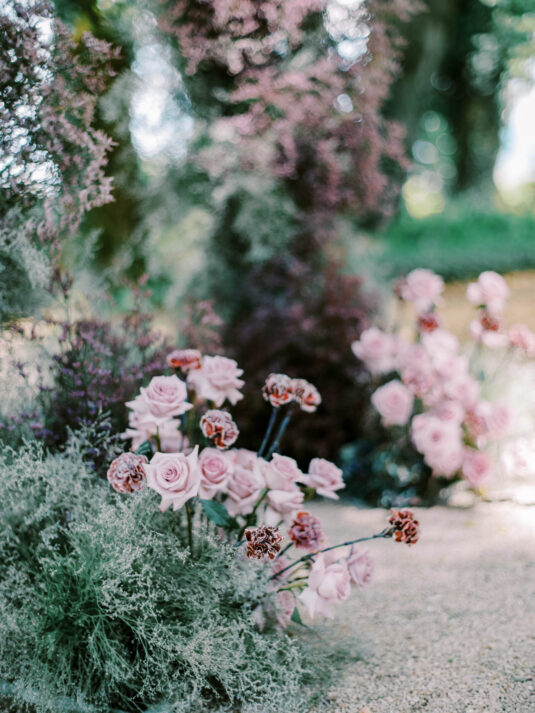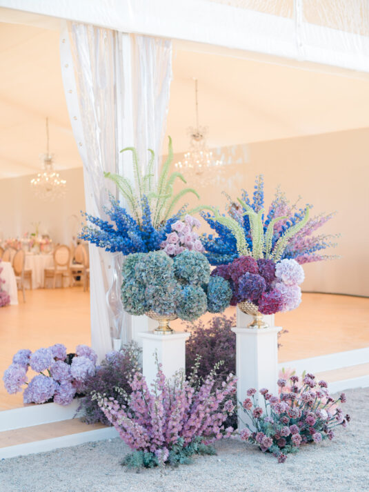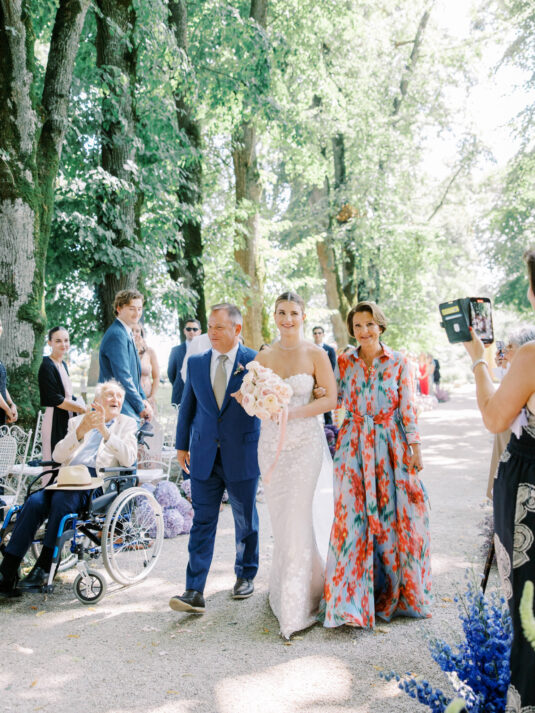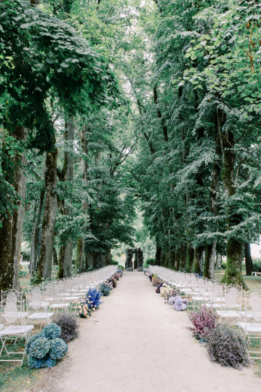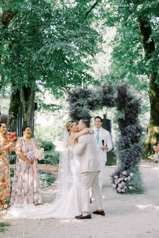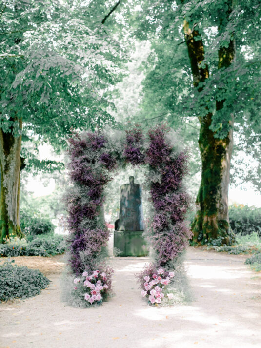 Guests were welcomed with cocktails inspired by the soft hues of the surrounding blooms before wandering through endless fields of irises en route to the ceremony. Tucked within a forest along a quiet equestrian alley, the ceremony setting felt both intimate and otherworldly—elevated further by the soulful sounds of a live gospel choir. A striking rectangular floral arch anchored the space, while the aisle was lined with lush arrangements in blush, apricot, and soft blue tones, creating an ethereal pathway that defined this unforgettable Switzerland destination wedding.