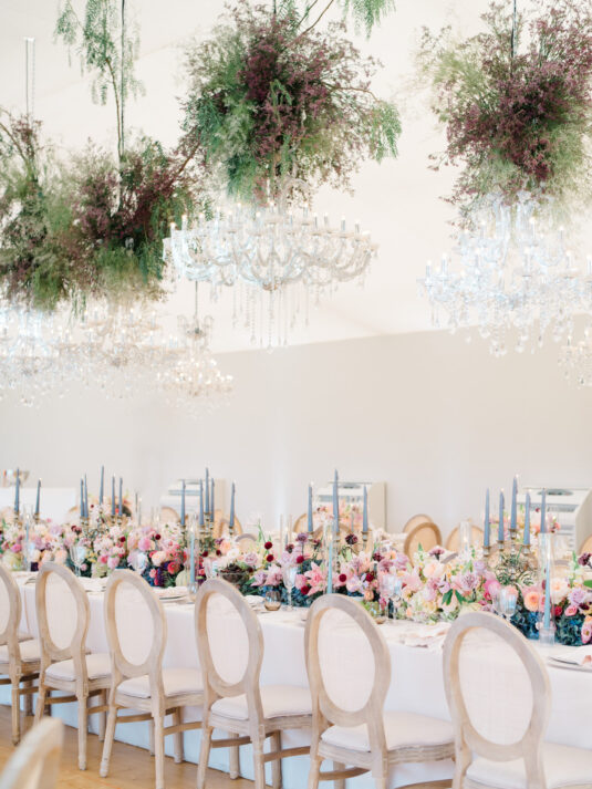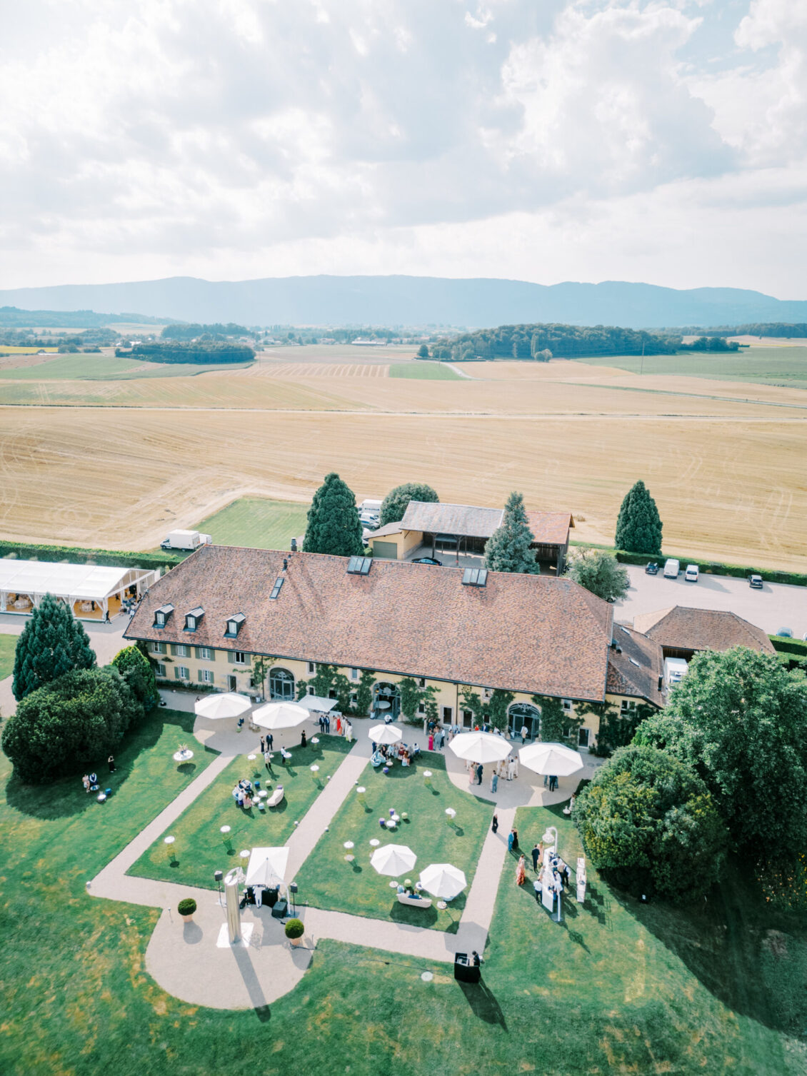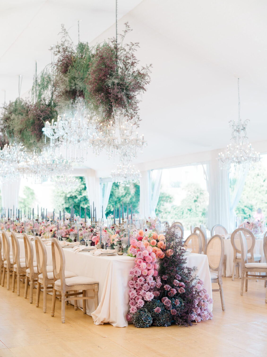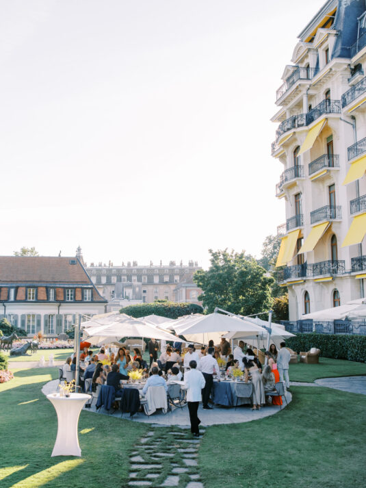 Following the ceremony, guests strolled back through the fields – an experience that perfectly captured why a Switzerland destination wedding is so coveted—before gathering for cocktails in front of the estate’s grand façade. Dinner was hosted beneath a tent adorned with chandeliers and suspended florals, where long tables were styled with low, garden-inspired arrangements and candlelight that flickered into the evening.