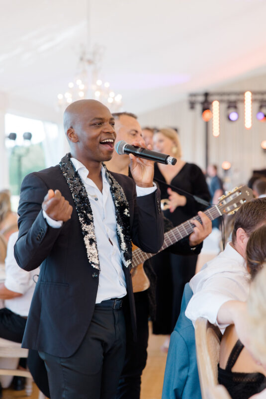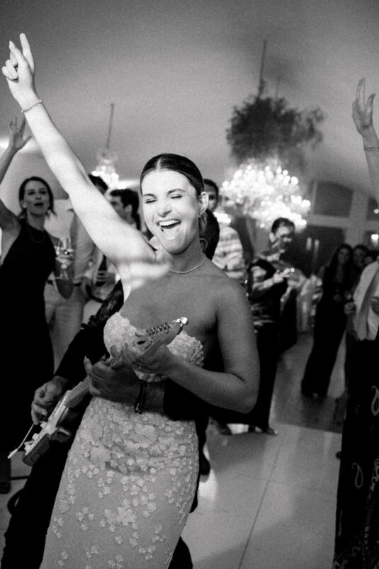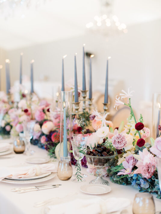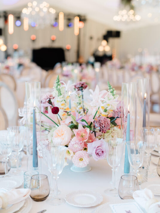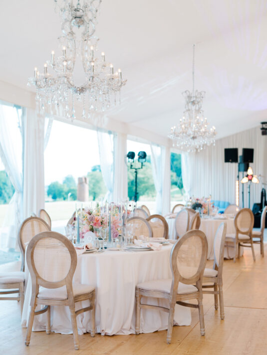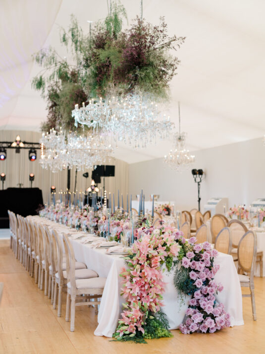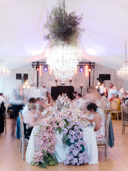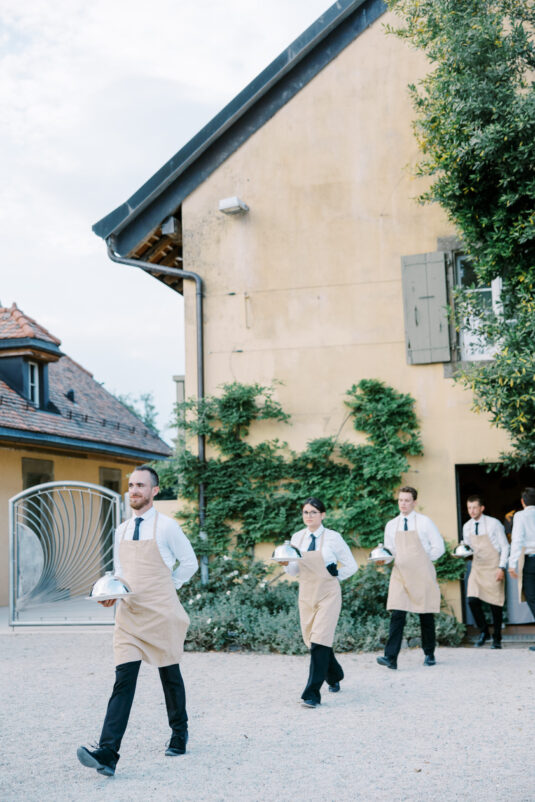Following the ceremony, guests strolled back through the fields – an experience that perfectly captured why a Switzerland destination wedding is so coveted—before gathering for cocktails in front of the estate’s grand façade. Dinner was hosted beneath a tent adorned with chandeliers and suspended florals, where long tables were styled with low, garden-inspired arrangements and candlelight that flickered into the evening.