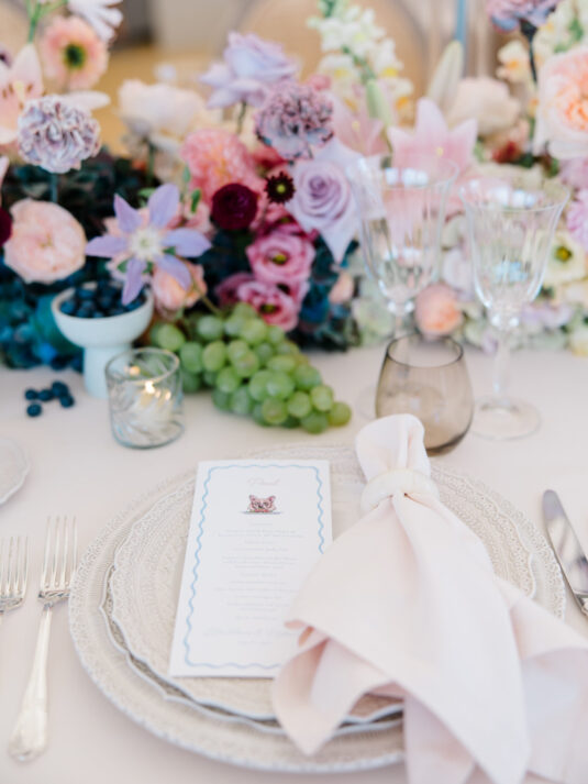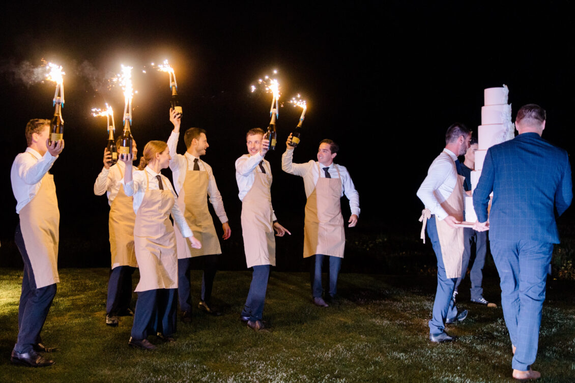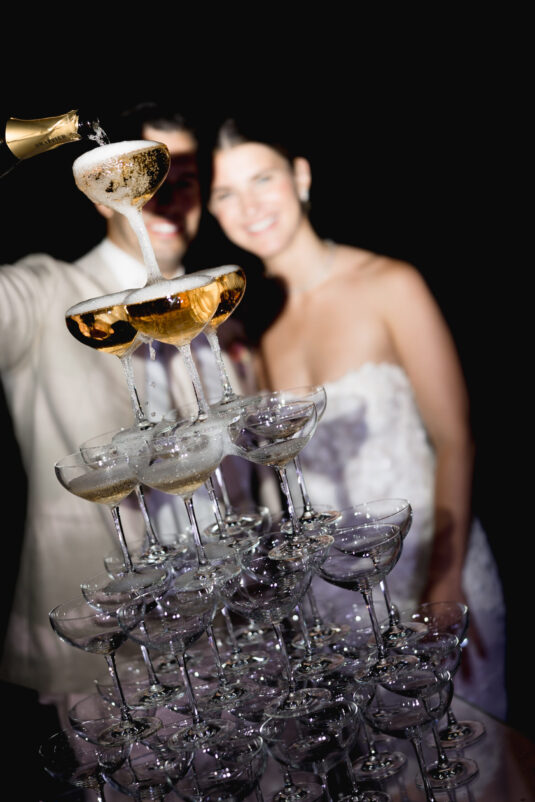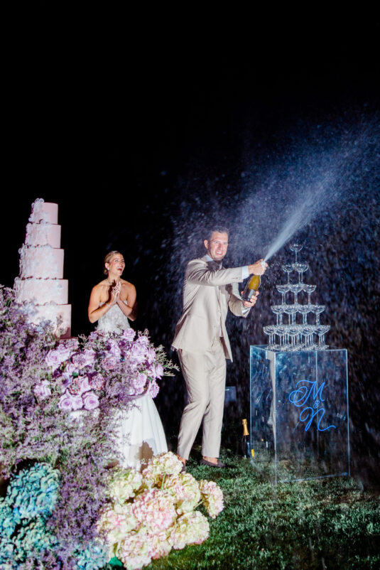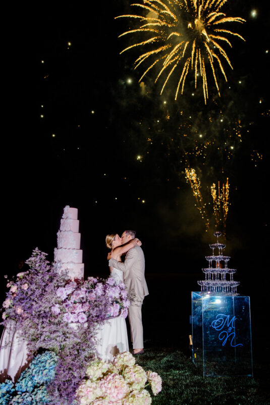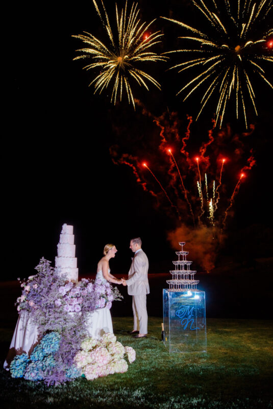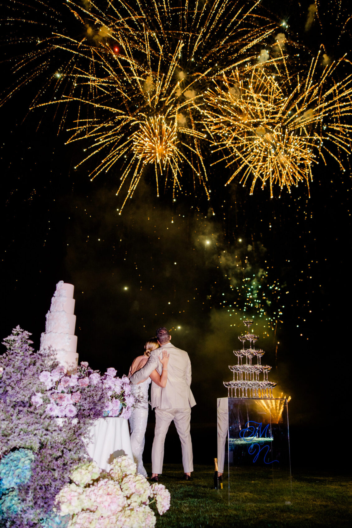 Personal details added depth to the celebration: the bride’s father designed the invitations, and his calligraphed initials were subtly incorporated into the dance floor. A six-tier cake, inspired by the bride’s gown, served as a stunning centerpiece before the night concluded with a surprise fireworks display—an emotional, unforgettable moment that reflected the magic of this Switzerland destination wedding.