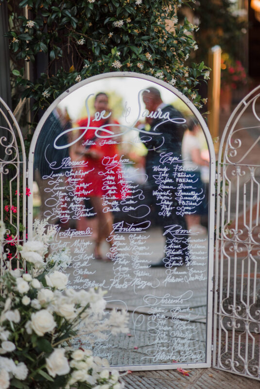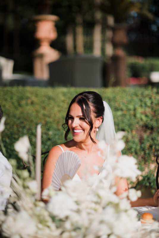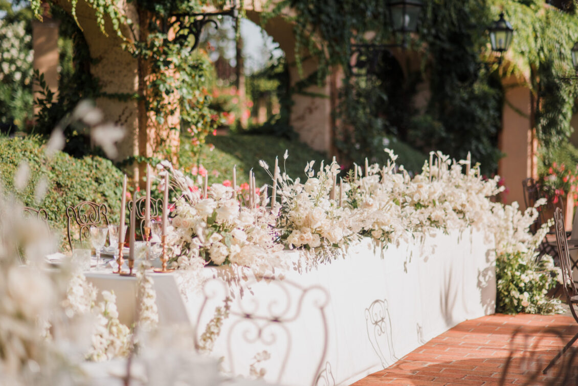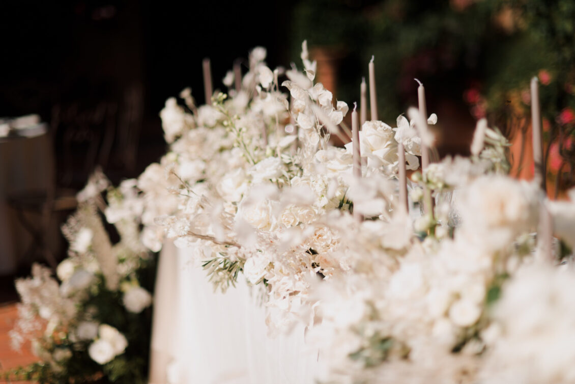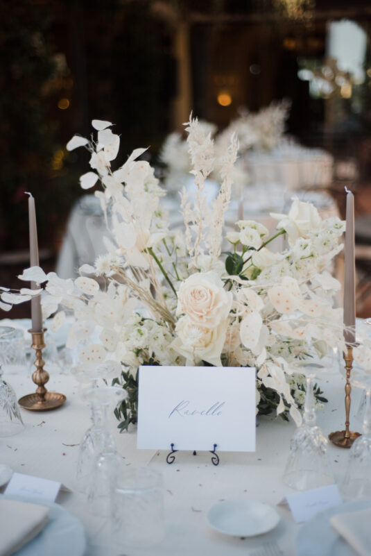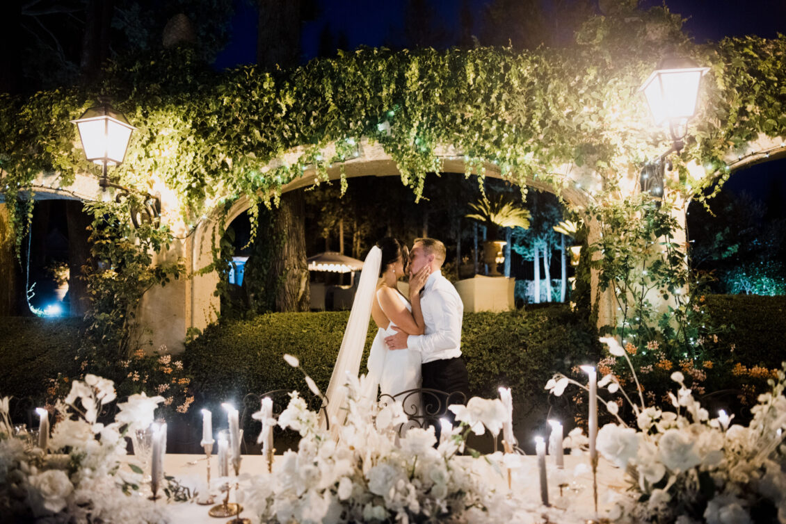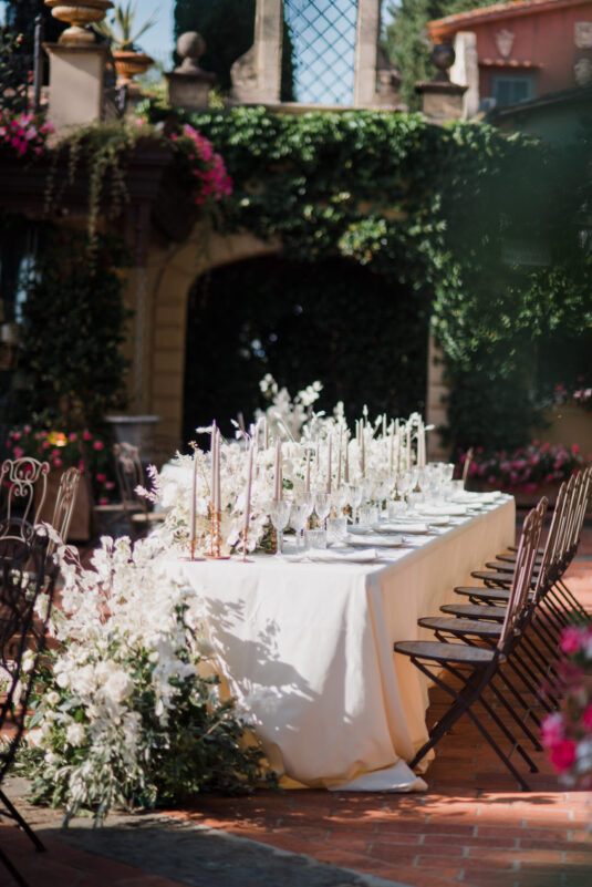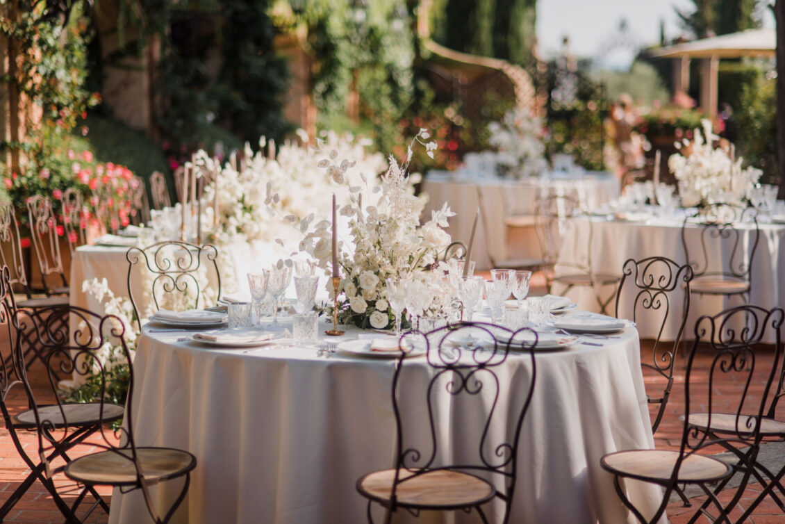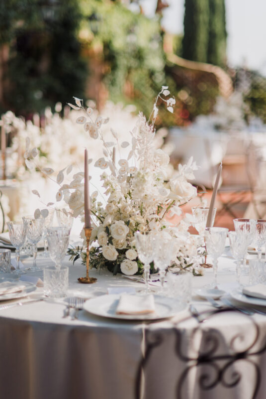 The venue itself, already rich with lush greenery and natural florals, inspired a restrained palette of white, taupe, and soft green tones. Rather than competing with the surroundings, the design enhanced them—creating a layered, organic aesthetic that defined this Tuscan destination wedding. Thoughtful tableware details and airy floral arrangements introduced a subtle sense of whimsy, while textured linens and candlelight added depth to the alfresco setting. The result felt intimate yet elevated, capturing the effortless elegance synonymous with a Tuscan destination wedding.