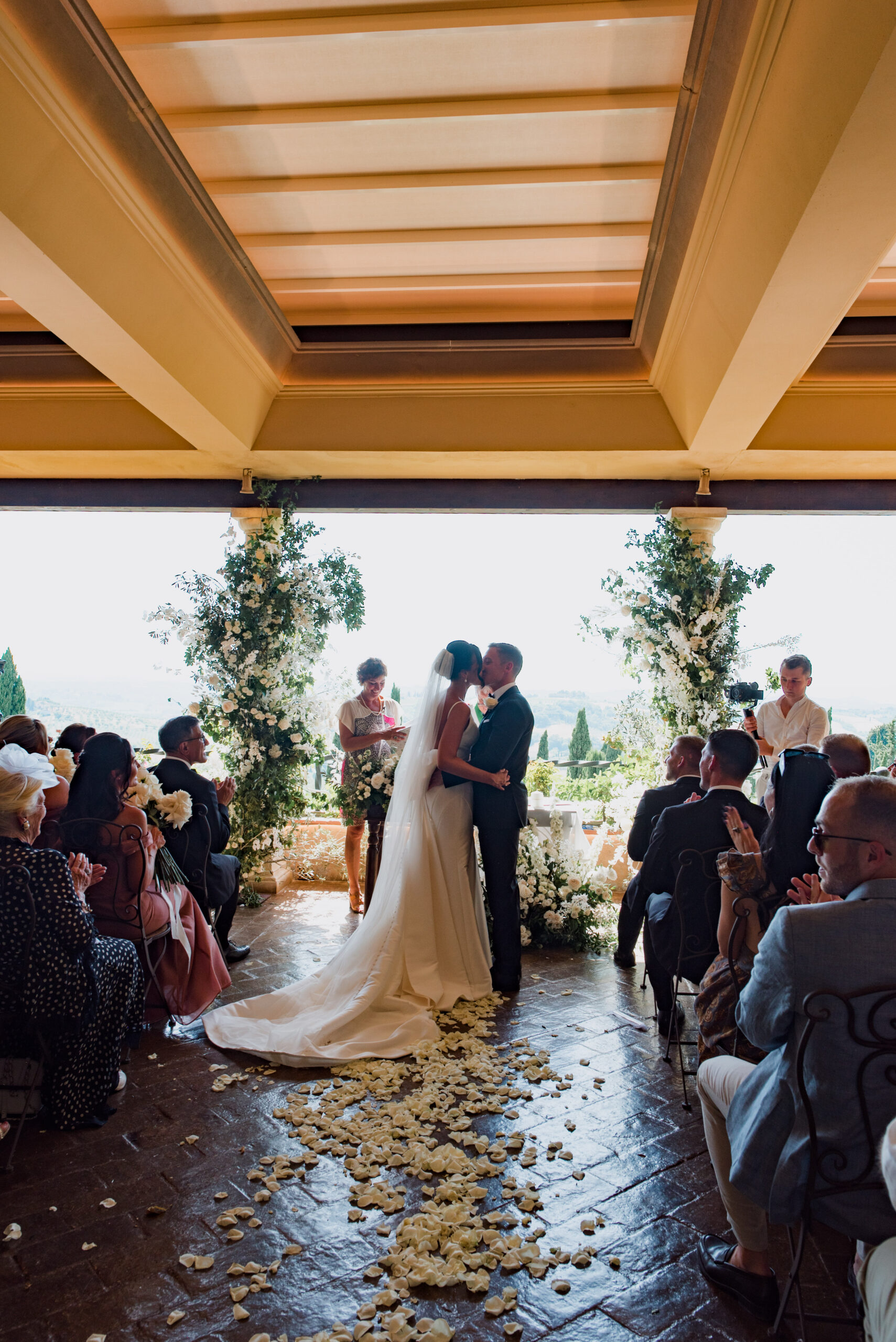 A bride and groom share a kiss at a Tuscan destination wedding ceremony, surrounded by seated guests, floral arrangements, and scattered white rose petals as sunlight streams in through the open indoor-outdoor space behind them.