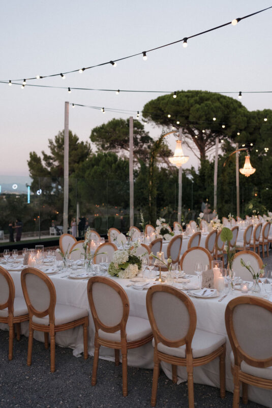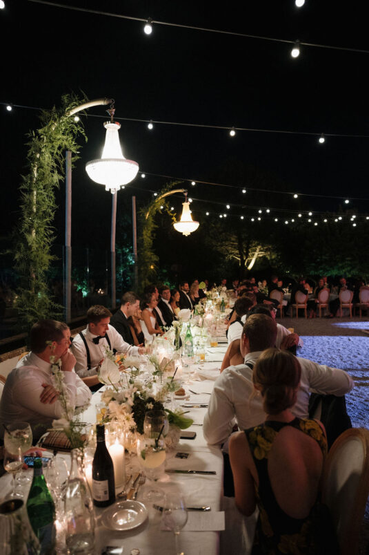 The ceremony unfolded beneath olive trees and layered greenery, where soft neutrals and refined white florals enhanced the natural landscape. A horseshoe-shaped dinner layout encouraged conversation and connection, while low arrangements and candlelight created an atmosphere of understated elegance. As dusk settled, chandeliers woven with trailing vines transformed the gardens into a glowing open-air ballroom—an unforgettable setting for this French Riviera destination wedding.