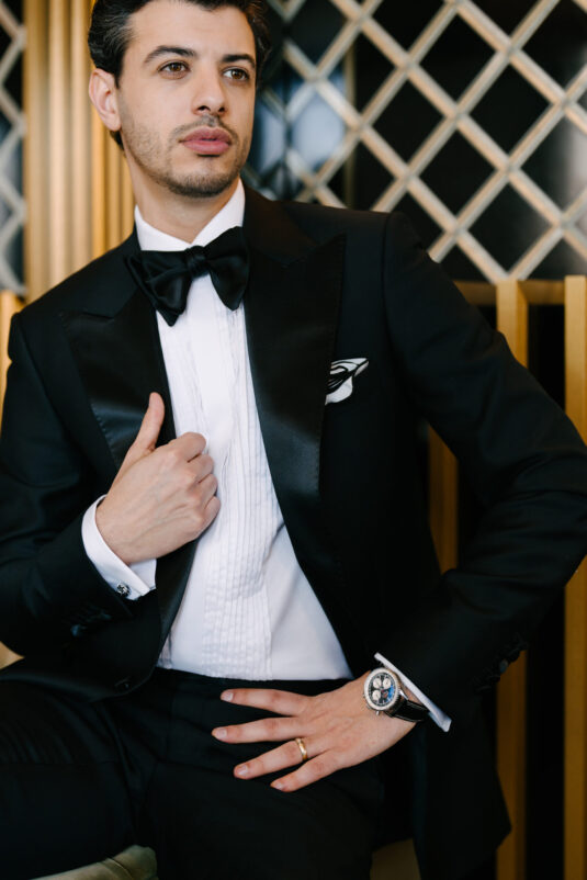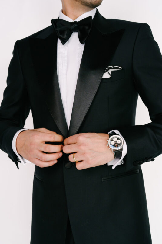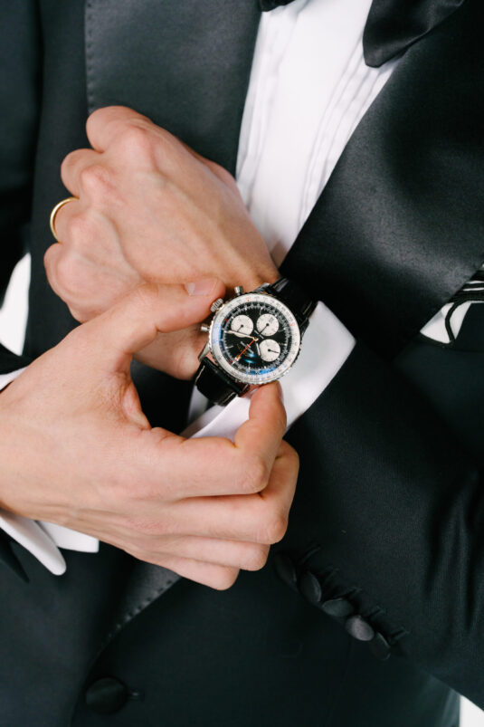 For the ceremony, the Classic Groom returns to timeless black tie. A perfectly tailored tuxedo with a satin peak lapel offers enduring sophistication, complemented by the Breitling Navitimer B01 Chronograph 41 – a pairing that reinforces the heritage foundation of modern groom fashion.