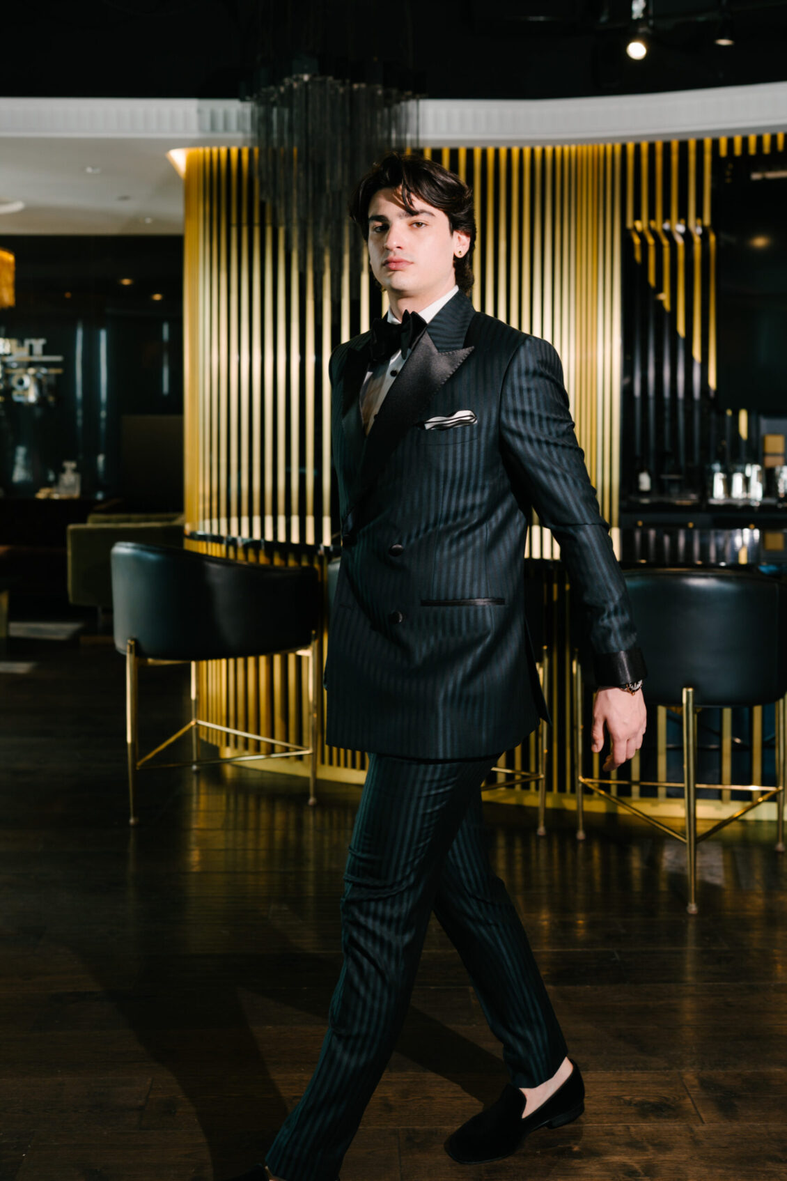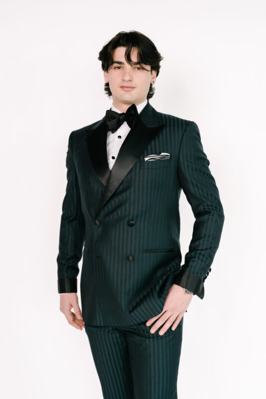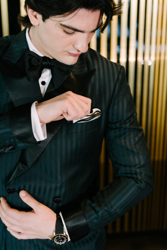 For evening, the Celebration Groom introduces boldness through a green and black striped double-breasted suit, elevated by a satin peak lapel. The interplay of texture and tone captures the energy of the reception, while the Breitling Superocean Heritage B31 Automatic 42 adds a layer of sophisticated edge—an expressive take on modern groom fashion.