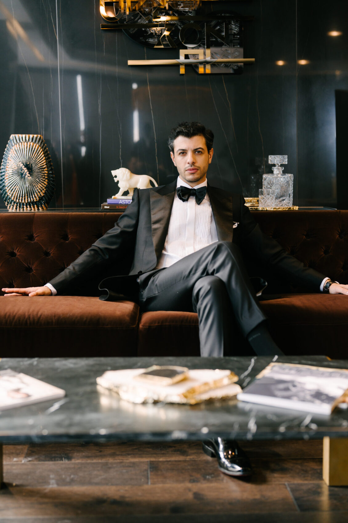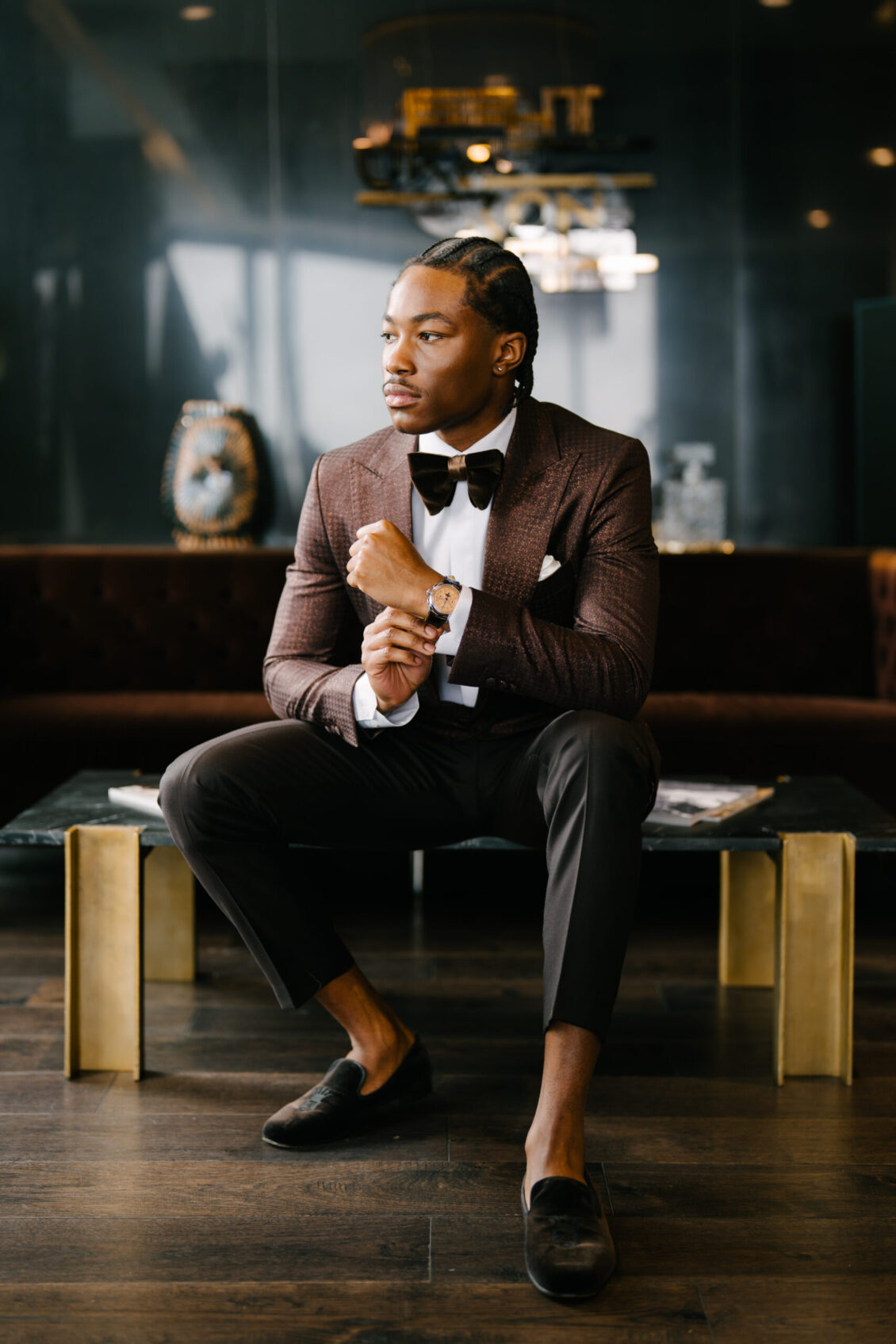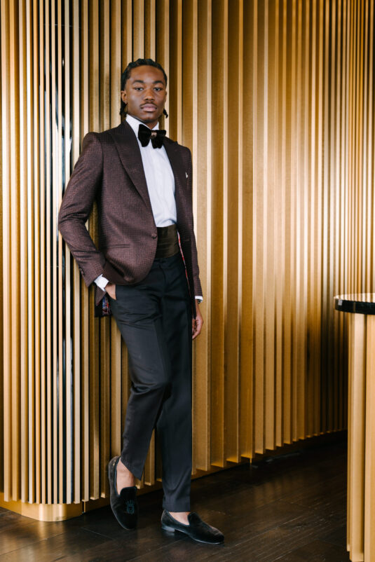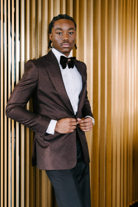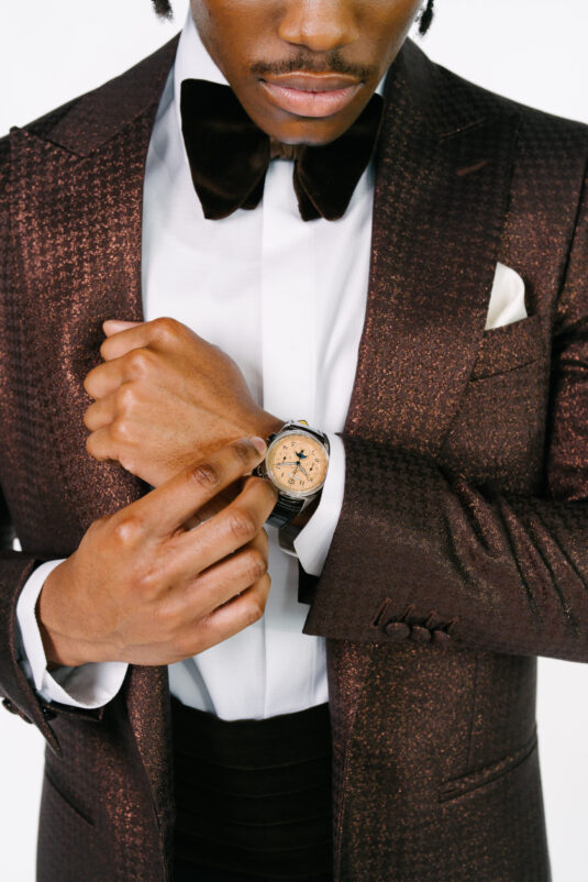 Closing with confidence, the Statement Groom embraces individuality in a copper houndstooth jacquard jacket. Rich in texture and tone, it’s a bold expression of personal style, elevated by the Breitling Premier B25 Datora 42—proving that modern groom fashion thrives on distinction.