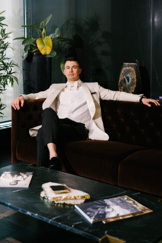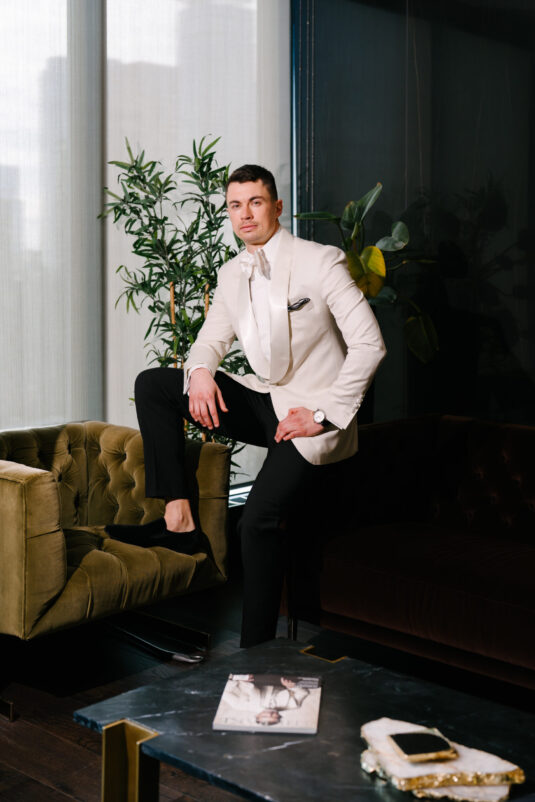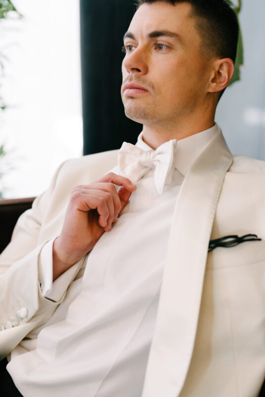 The Modern Icon refines the narrative with a crisp white tuxedo jacket and clean shawl lapel. Minimal yet striking, it balances tradition with restraint. Paired with the Breitling Premier B09 Chronograph 40, the look channels a contemporary interpretation of modern groom fashion rooted in effortless elegance.