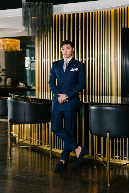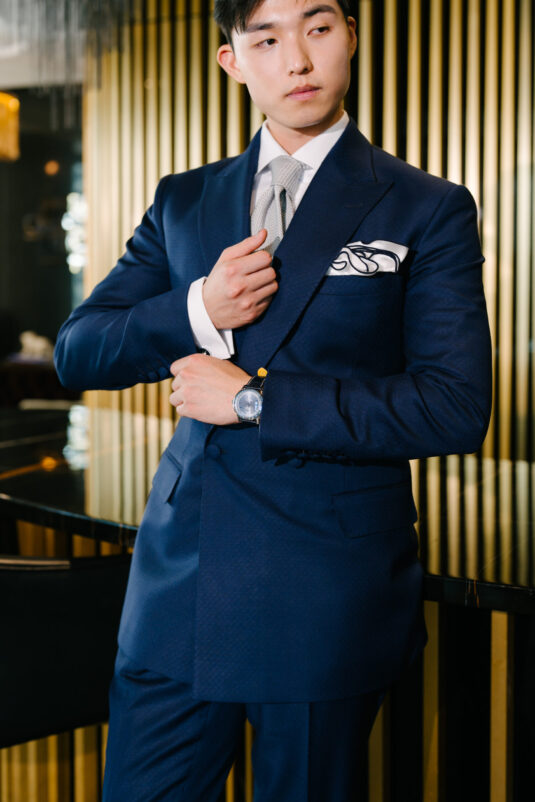 The Power Groom leads with authority in a navy double-breasted suit, sharply tailored with peak lapels and refined detailing. The silhouette is structured yet modern, embodying the quiet confidence at the heart of modern groom fashion. Finished with the Breitling Navitimer Automatic 41, the look feels precise, polished, and intentionally commanding.