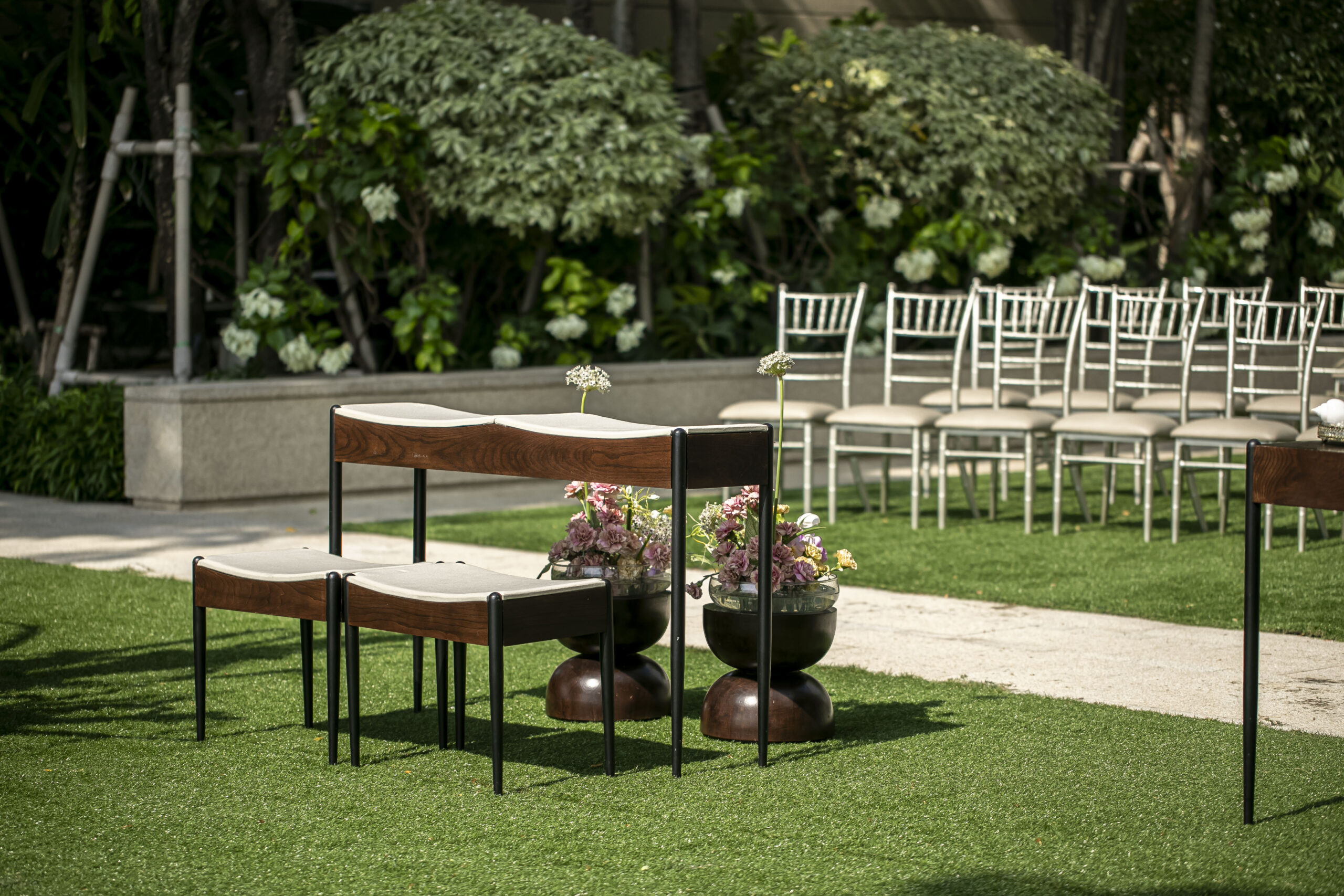 Outdoor wedding setup at Capella Bangkok, featuring white chairs in rows on grass, two wooden tables with metal legs, and floral arrangements in pots, all surrounded by lush green bushes and sunlight filtering through the trees.