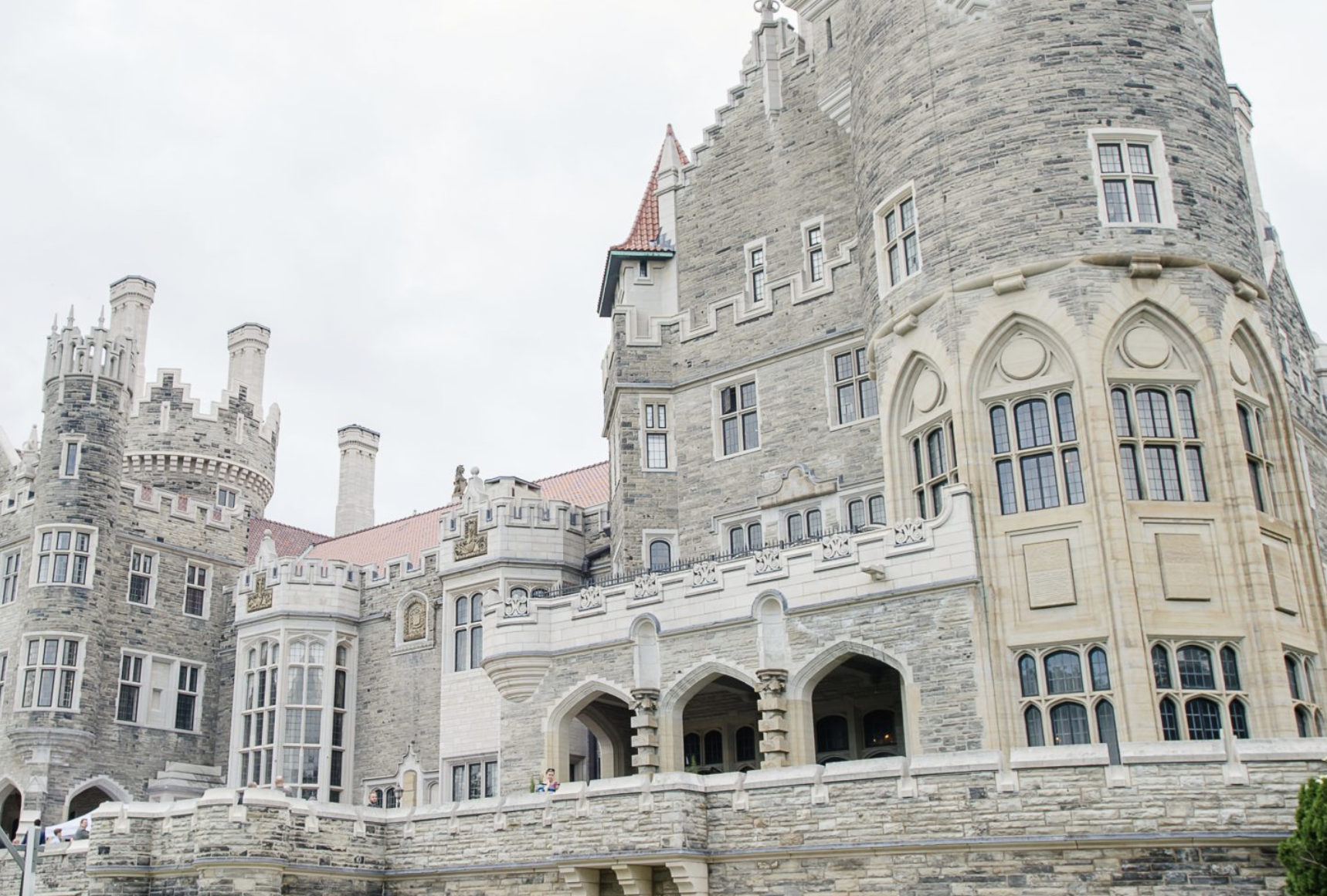 A large, historic castle with gray stone walls and ornate turrets under a cloudy sky sets the perfect backdrop for a dreamy wedding reception. The building showcases arched windows and detailed architecture, blending Gothic and Romanesque styles, ideal for an unforgettable Toronto celebration.