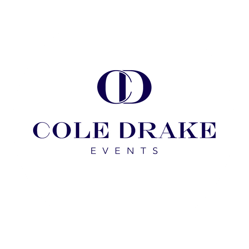 Logo for Cole Drake Events on a white circular background. The stylized initials “CD” appear above the company name, with “Cole Drake Events” in navy blue and “EVENTS” displayed in bold uppercase letters below.