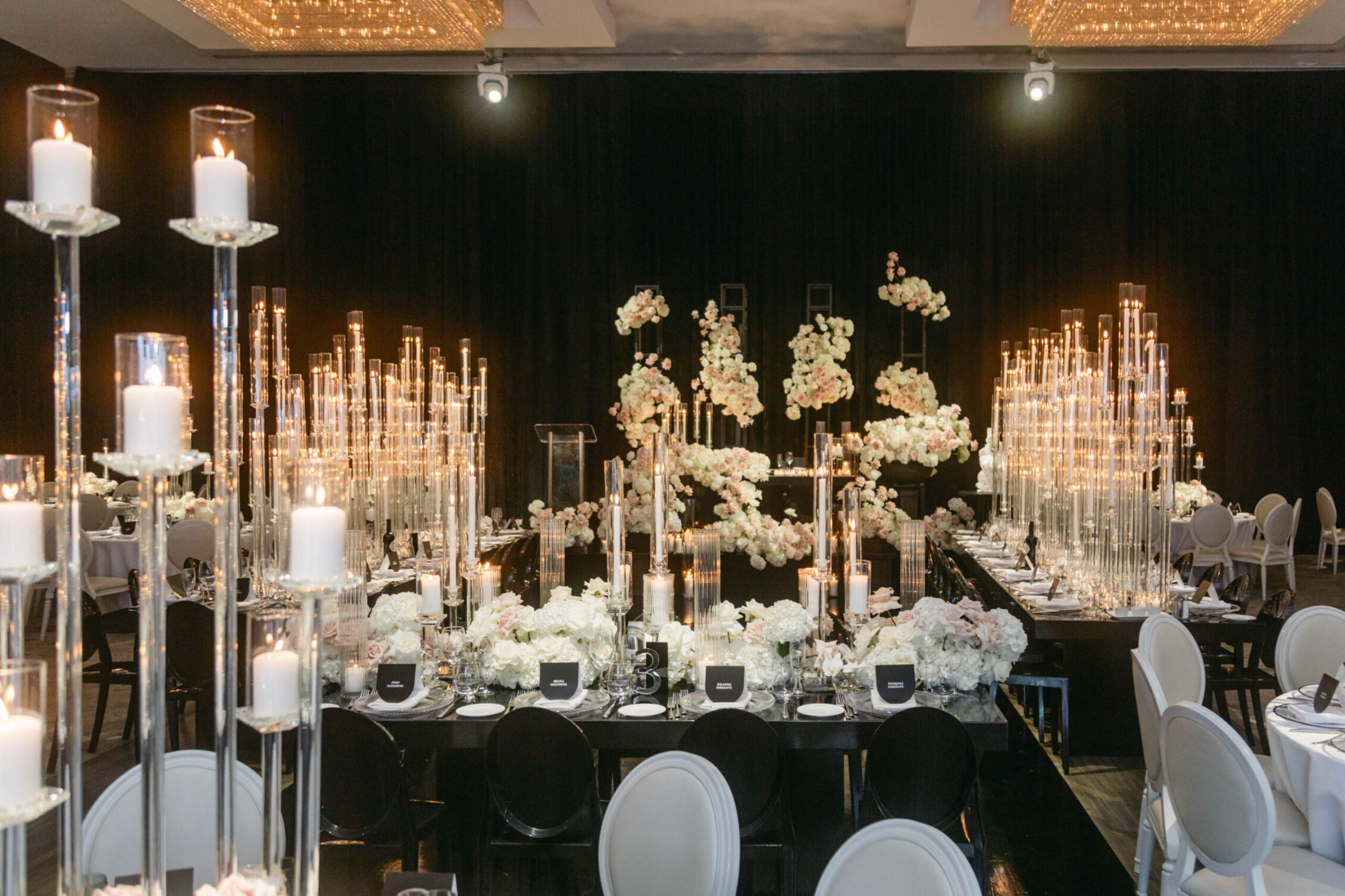 A luxurious wedding decor setup in Toronto features long tables adorned with elegant white floral arrangements and tall, cylindrical candle holders. The room is dimly lit, highlighting the soft glow of numerous candles and creating an intimate ambiance.
