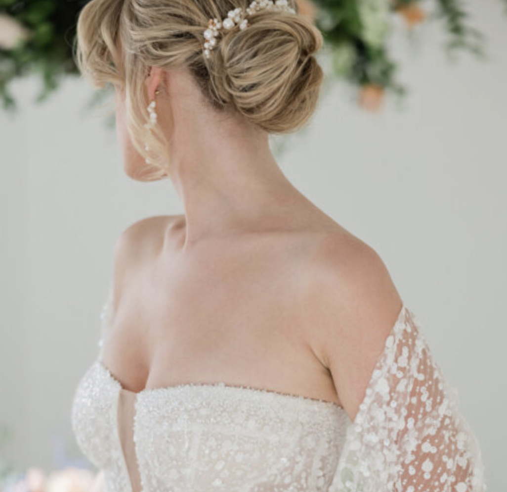 A woman with blonde hair styled by a renowned wedding hairstylist from Toronto showcases an elegant updo adorned with pearls. She dons a strapless white wedding dress featuring floral lace details, looking away amid green foliage and vibrant orange flowers.