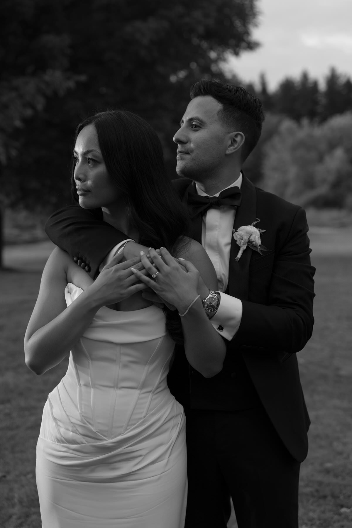 A bride and groom stand outdoors as the groom embraces the bride from behind, both gazing thoughtfully into the distance. Captured by Morning Light Photography, this black and white photo highlights their timeless elegance.