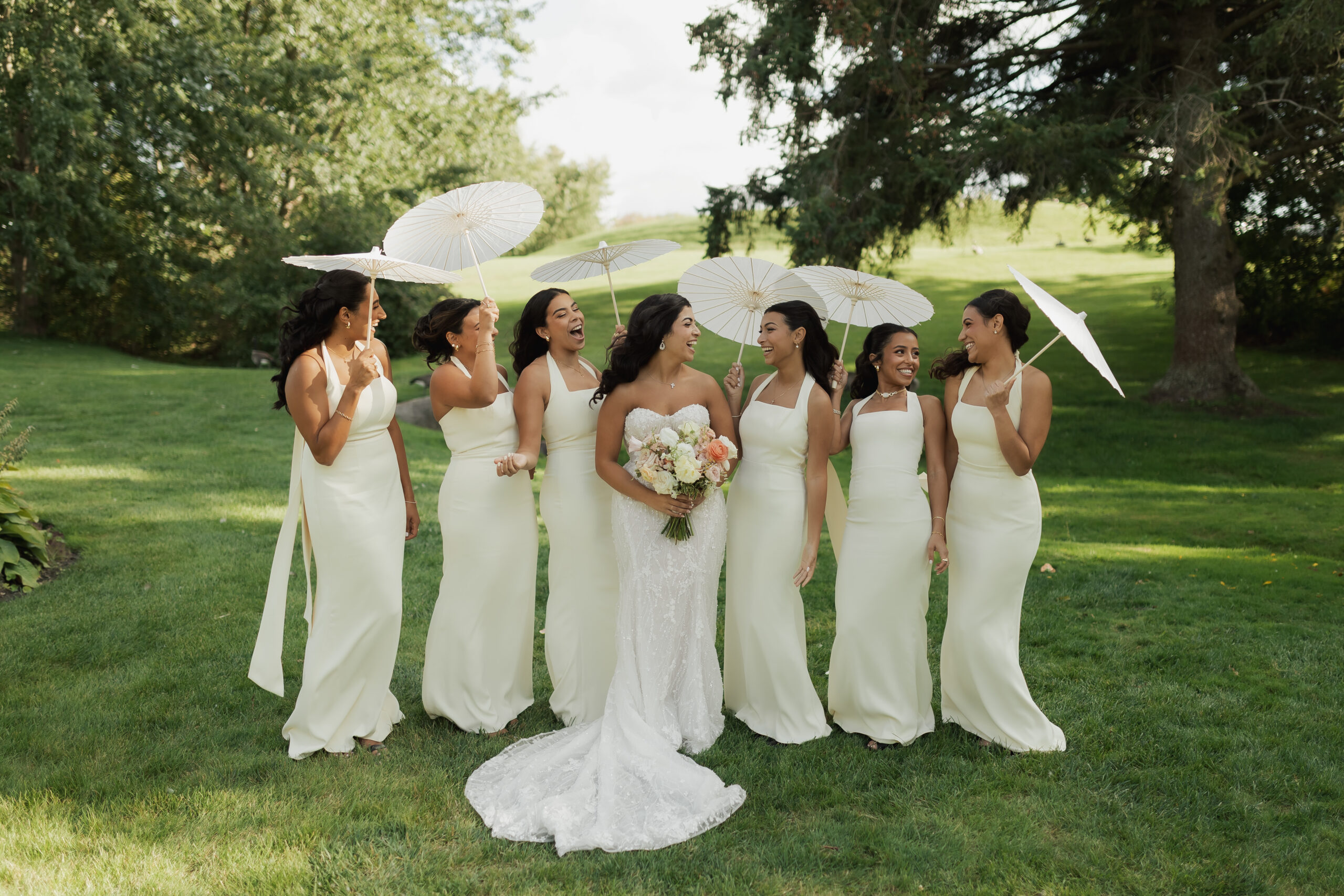 A bride in a white gown stands on grass with six bridesmaids in matching light dresses, all holding white parasols and smiling at each other—a joyful moment captured by Milestone Design on a sunny day with trees in the background.