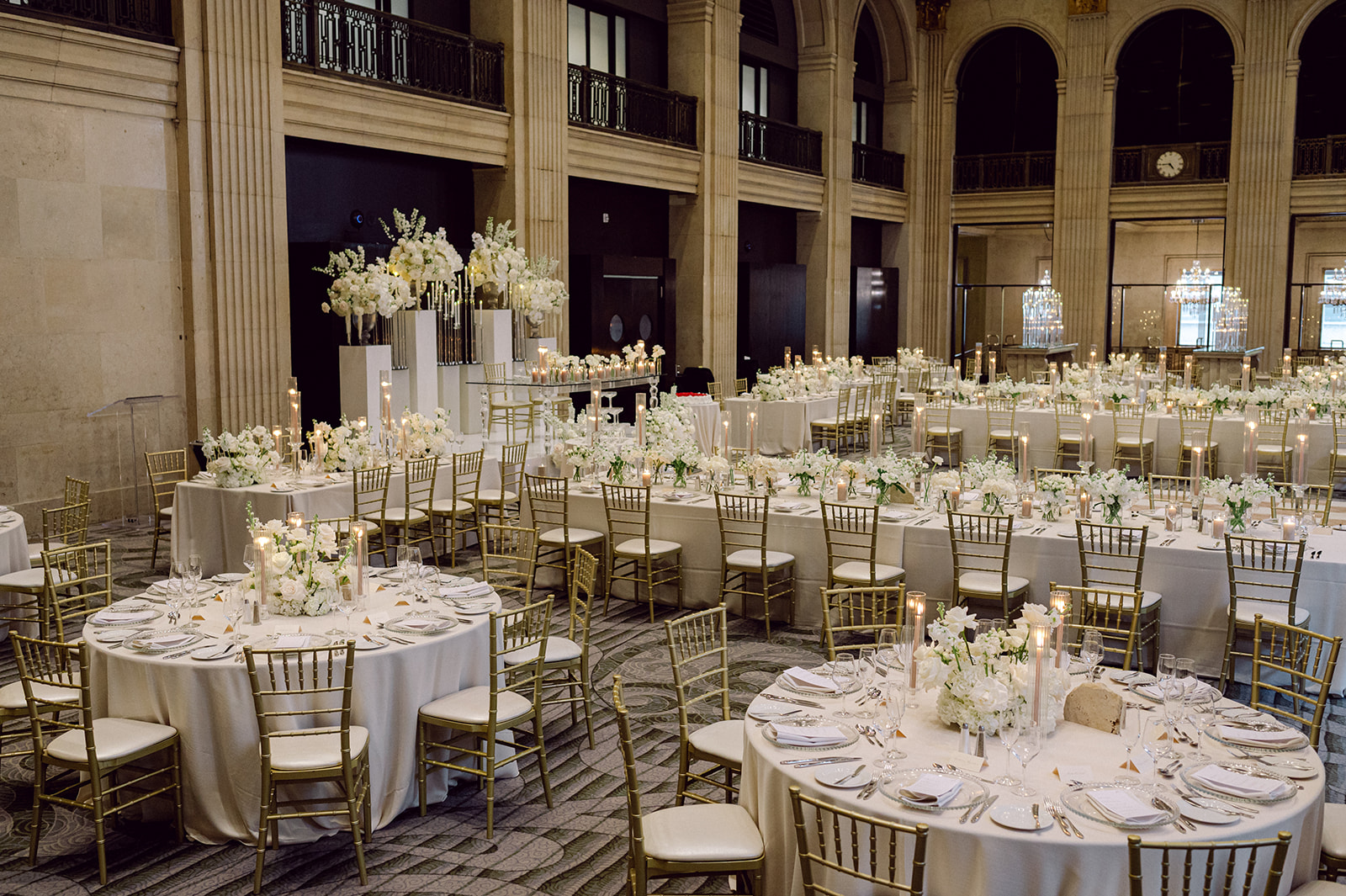 Elegant banquet hall set for a wedding reception in Toronto, with round and rectangular tables draped in white linens, gold chairs, floral centerpieces, and candles, all surrounded by tall columns and large arched windows.