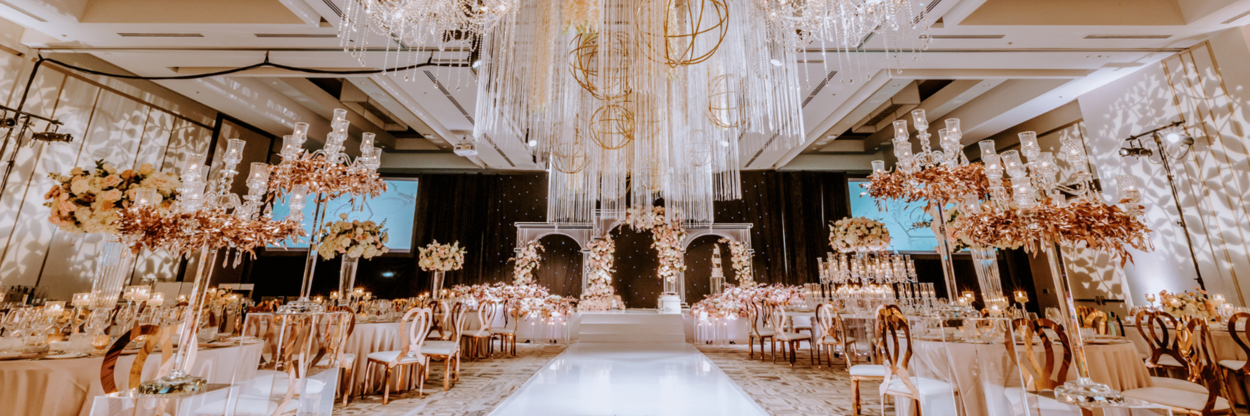 A luxury wedding venue in Vancouver, featuring elegant floral centerpieces, gold accents, tall candle holders, and sparkling chandeliers. A glossy white aisle leads to a decorated stage under cascading ribbons and twinkling lights.
