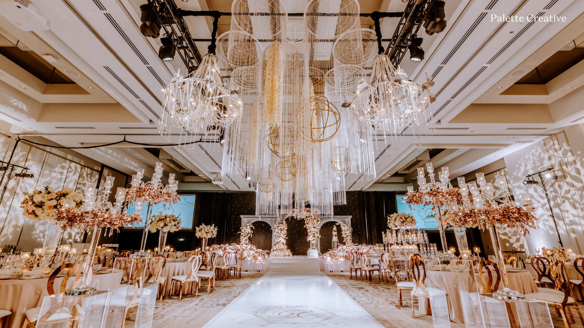 A luxurious wedding reception hall in Vancouver, this luxury wedding venue features chandeliers, golden accents, floral centerpieces, tall candles, draped fabric, and a glossy white aisle leading to a flower-adorned stage under cascading lights.