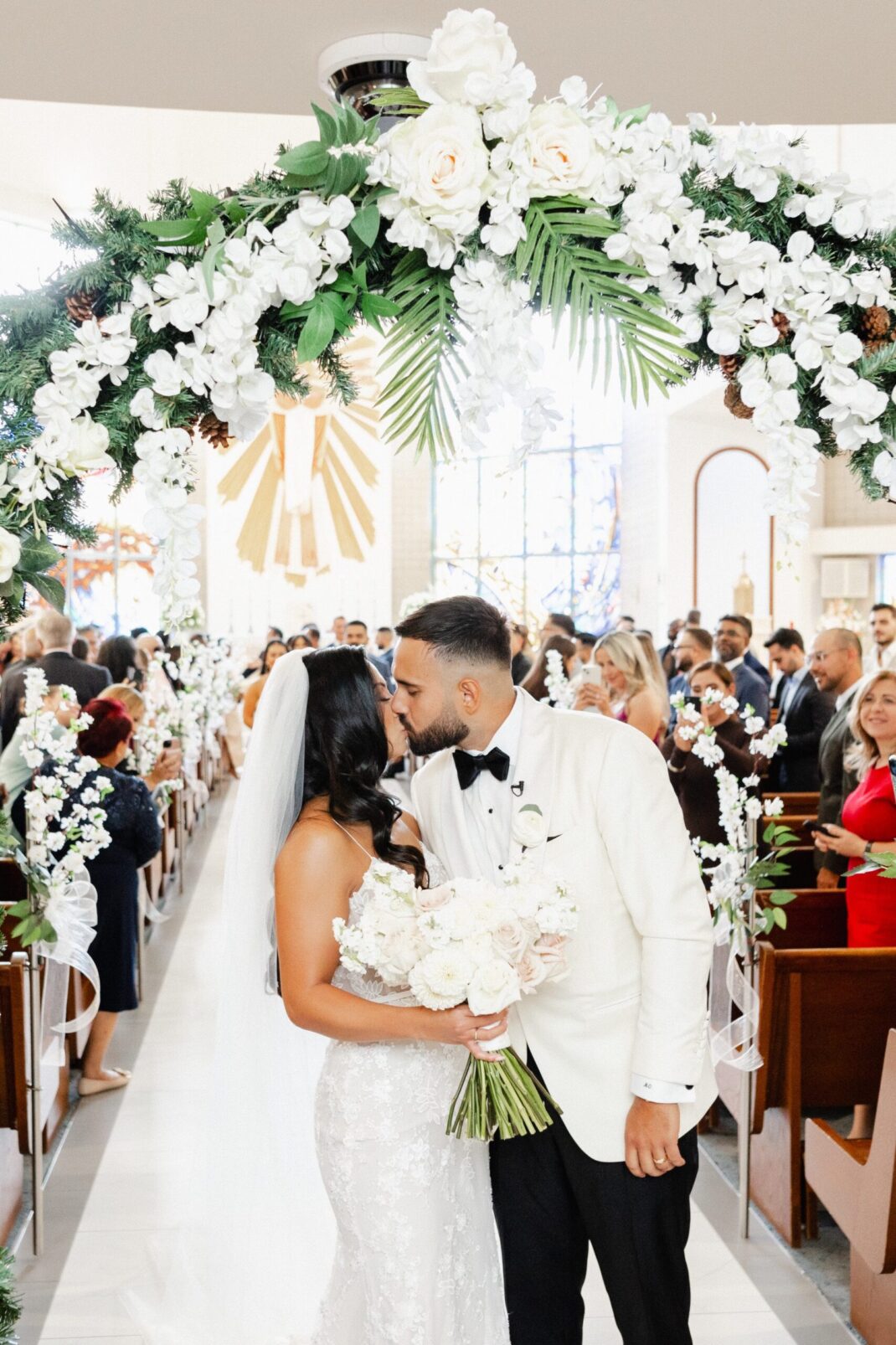 A bride and groom kiss under a floral arch in a church, surrounded by guests seated in pews. The bride holds a bouquet of stunning wedding flowers in Toronto hues, and the groom wears a white suit. The decor includes white blooms and lush greenery.