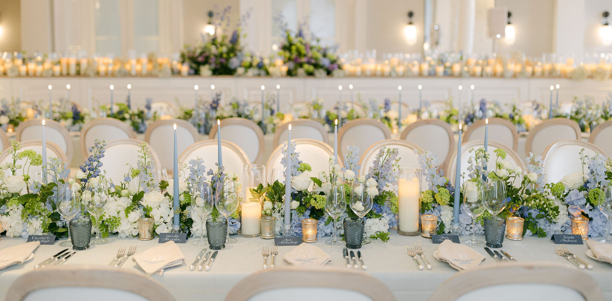 Elegant wedding reception setup for High Profile Events with long tables adorned with white and blue floral arrangements, candles, and glassware in a bright, airy room featuring large windows and chandeliers.