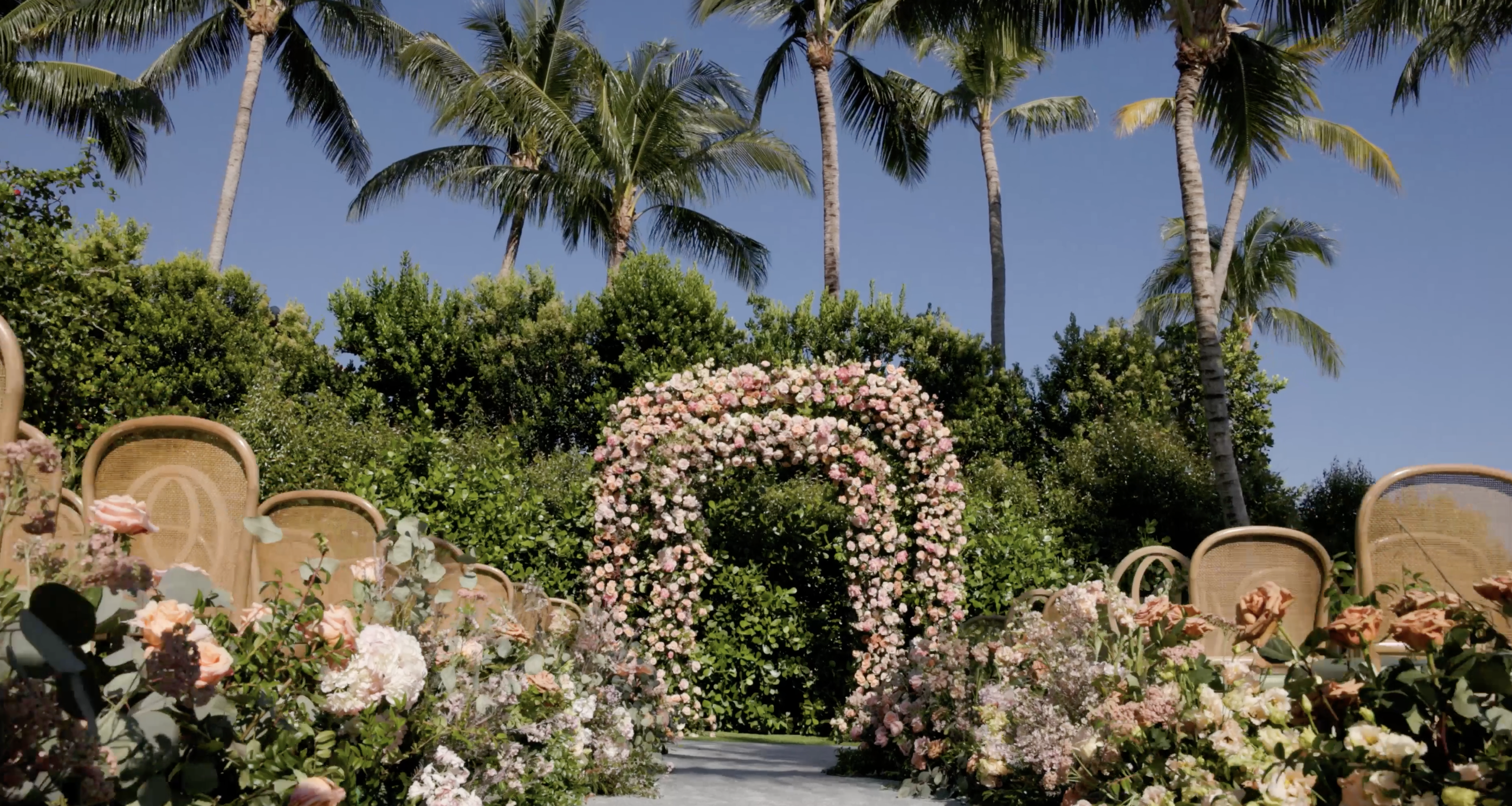 A floral arch adorned with pink and white roses stands in a lush garden setting, perfect for capturing stunning wedding videography. Surrounded by greenery and palm trees under a clear blue sky, the scene is peaceful and inviting.