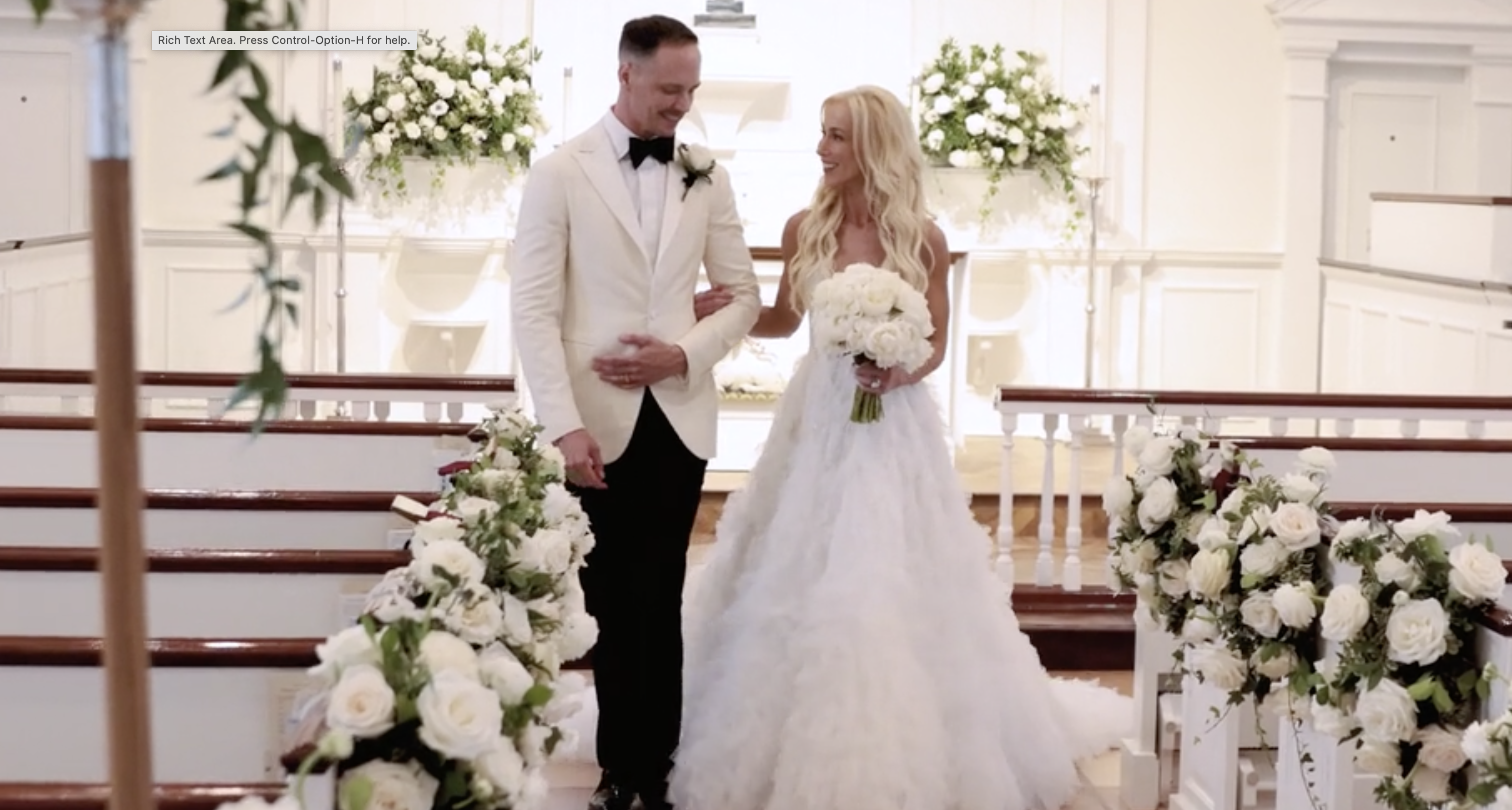 A couple joyfully walks down the aisle after their wedding ceremony, perfectly captured by their wedding photographer and videographer. The groom is in a white jacket and black pants, and the bride wears a flowing white gown. White flowers and greenery adorn the aisle, leading to an elegant altar.
