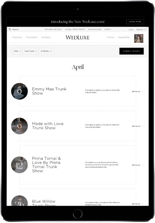 Unbeatable fresh features include geo-targeted resources, all-new “Inspiration Galleries” that showcase the best of our library by item, and an Insider Membership Portal that allows users to ‘save their fav’ images and vendors for the ultimate set of planning tools. We hope you love the new WedLuxe.com as much as we do!