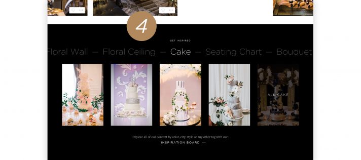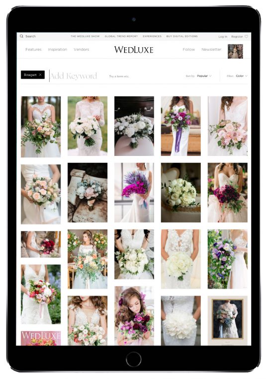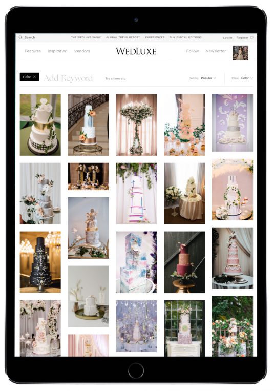 When logged in to your WedLuxe account, you can “heart” your fav photos from either a blog post or the Inspiration Gallery and return to them later. When in the Inspiration Gallery, you can browse through categorized photo galleries to find endless inspiration and vendors. You can search for amazing content by entering keywords, and from there, you can sort the images by popularity or date, and even by color. Search for categories like “mini desserts,” “cakes,” “floral walls,” “tablescapes,” “inviations,” or “bouquets,” etc. and spend hours scrolling.